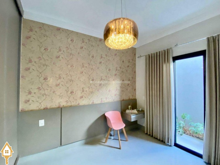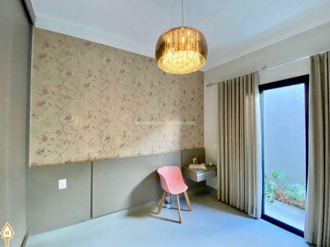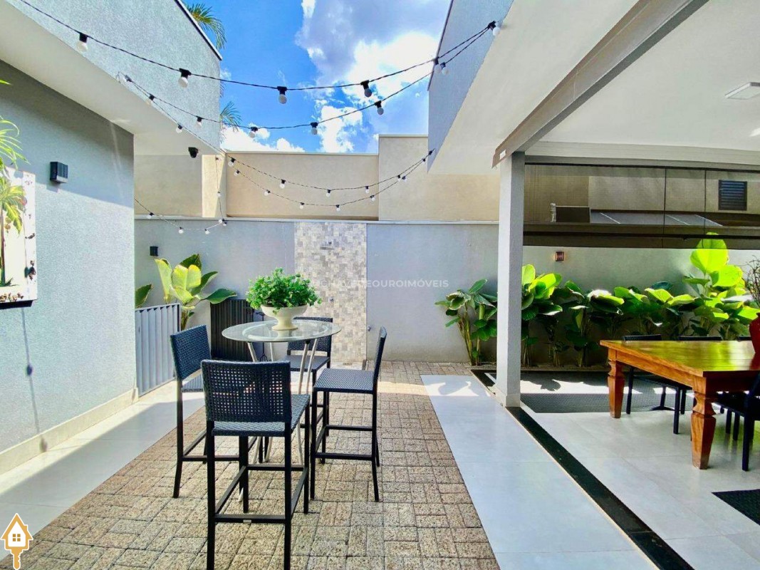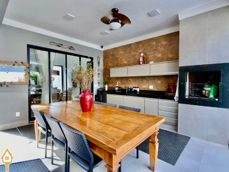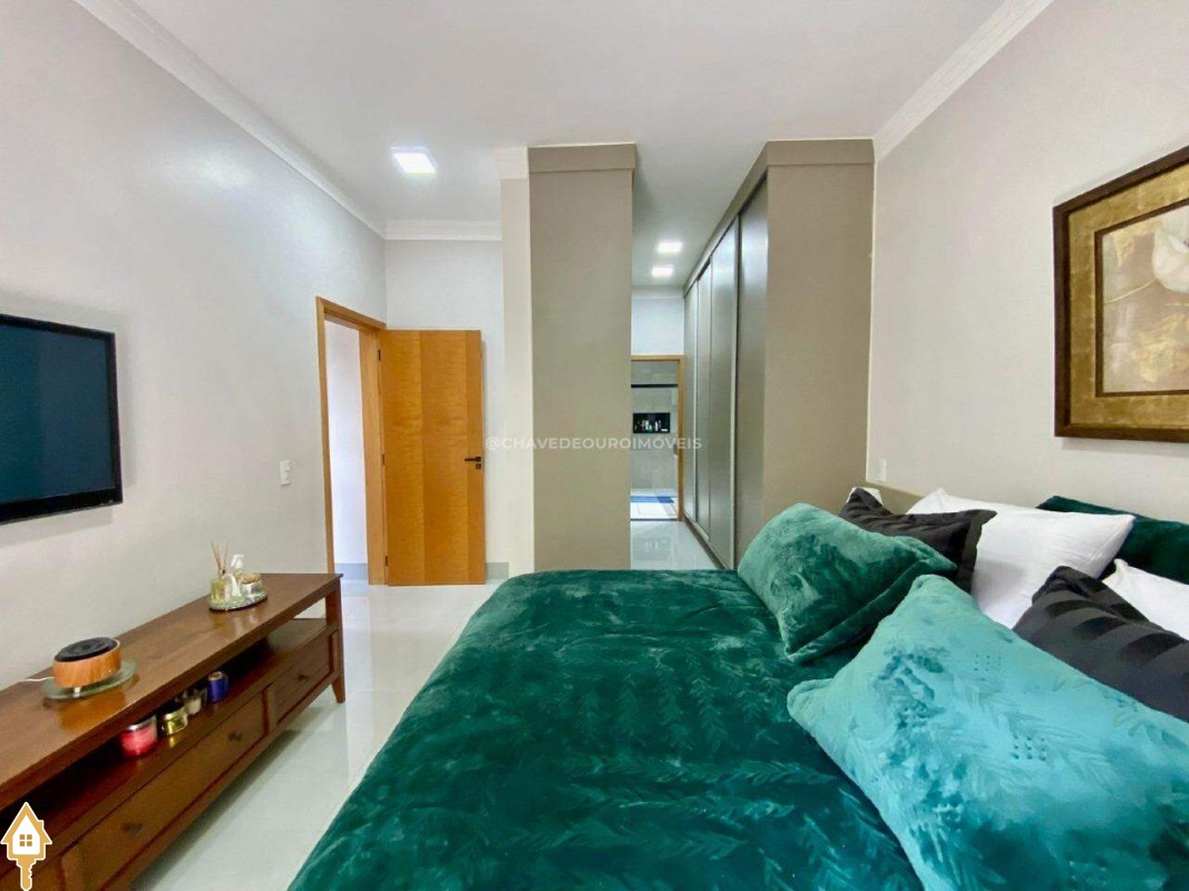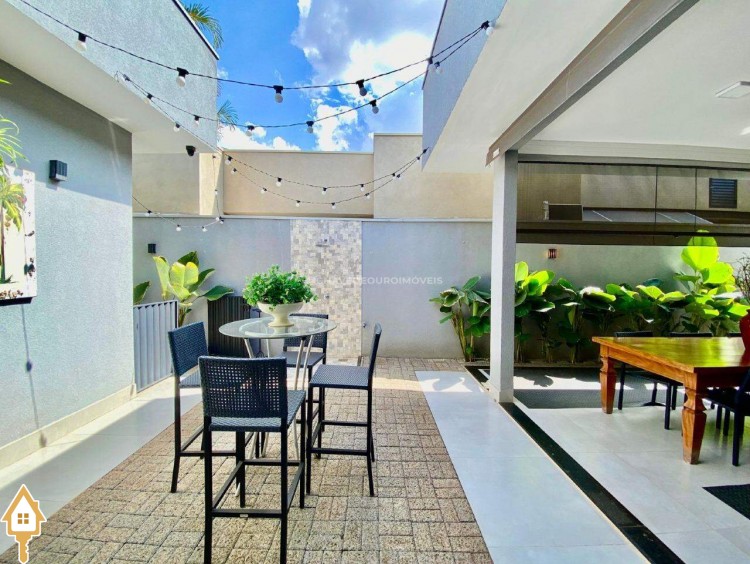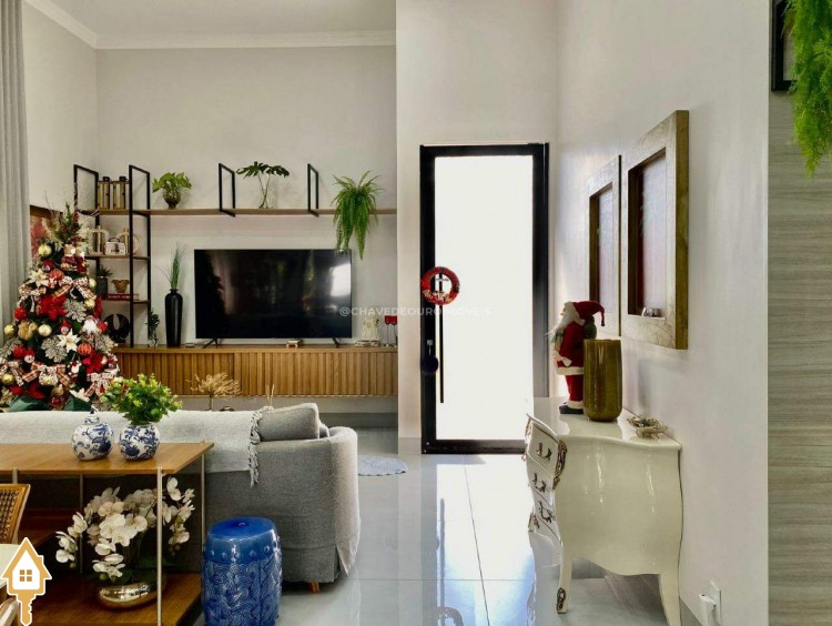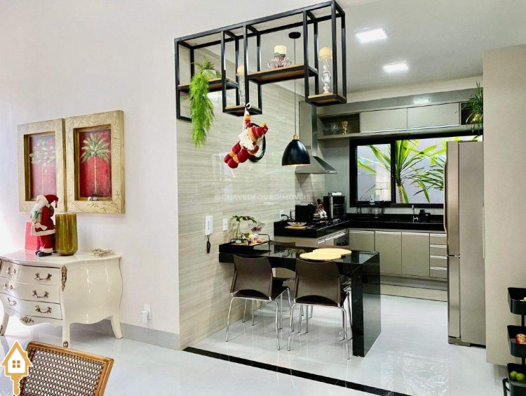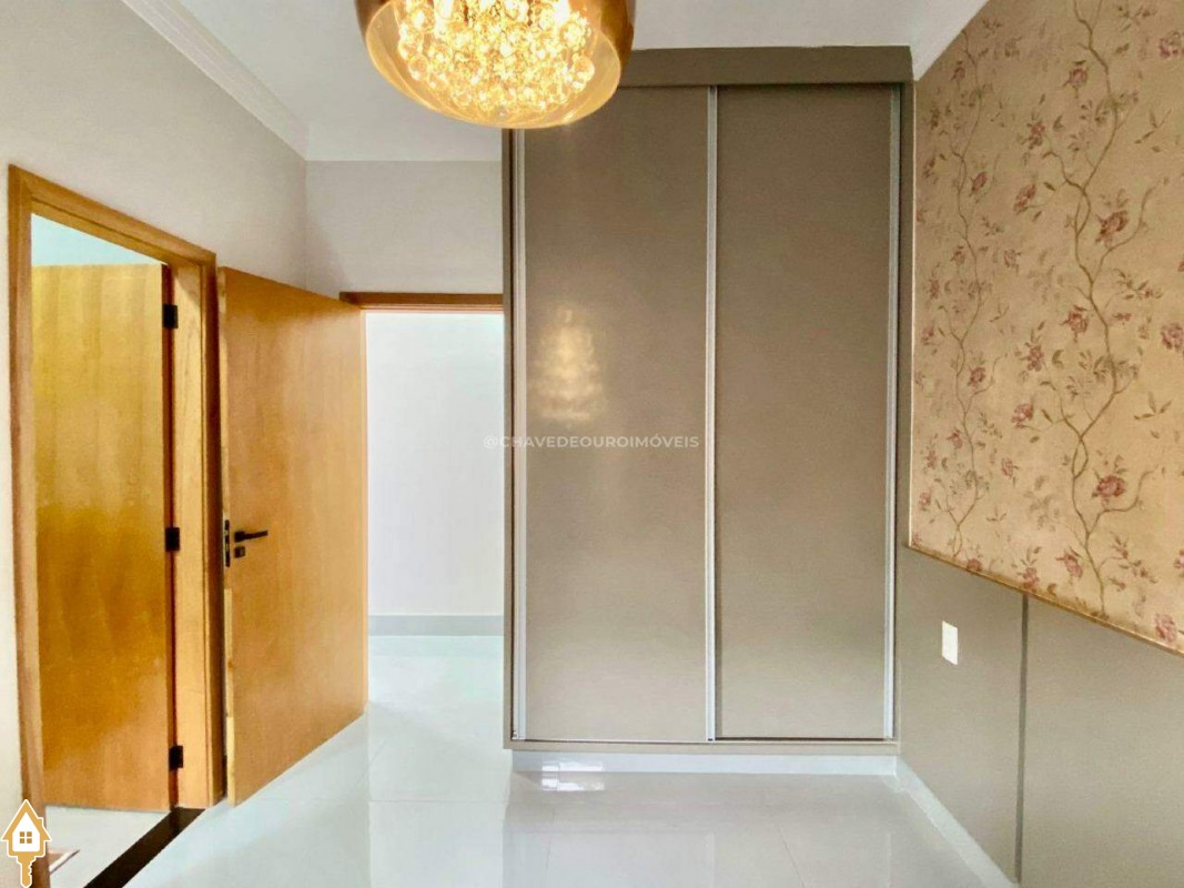 Casa localizada no condomínio Estância dos Ipês em Uberaba, MG. Composta de três suítes com ar-condicionado, armários e box, sendo uma com closet. Dispõe de lavabo com armário, papel de parede e lustre, cozinha tipo americana equipada com armários, cooktop, forno e depurador de ar. Conta com sala de estar e jantar com pé direito duplo, integradas à cozinha e varanda gourmet equipada com armários, churrasqueira a carvão, toldo de proteção solar e área de quintal aberta, quatro vagas de garagem, sendo duas cobertas,