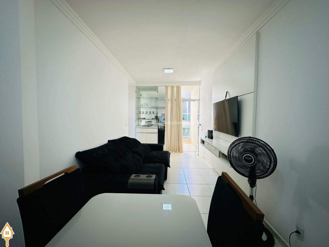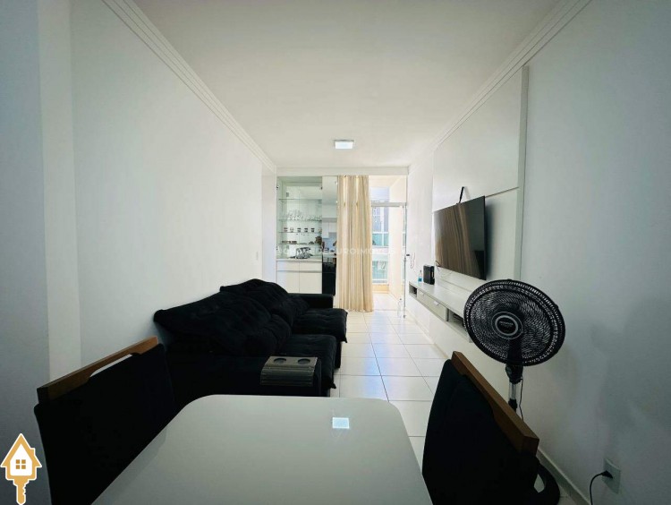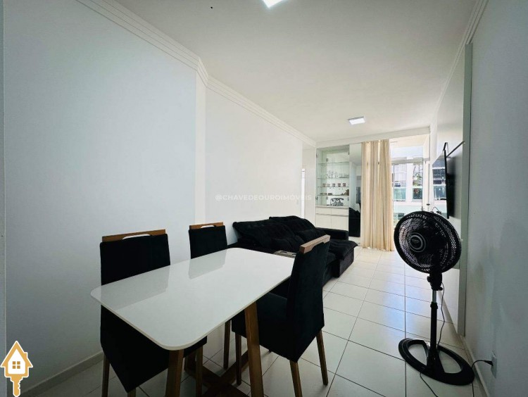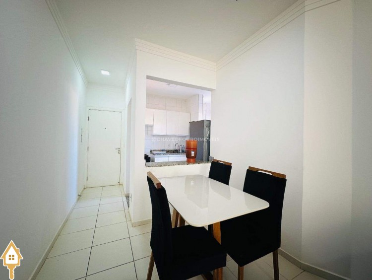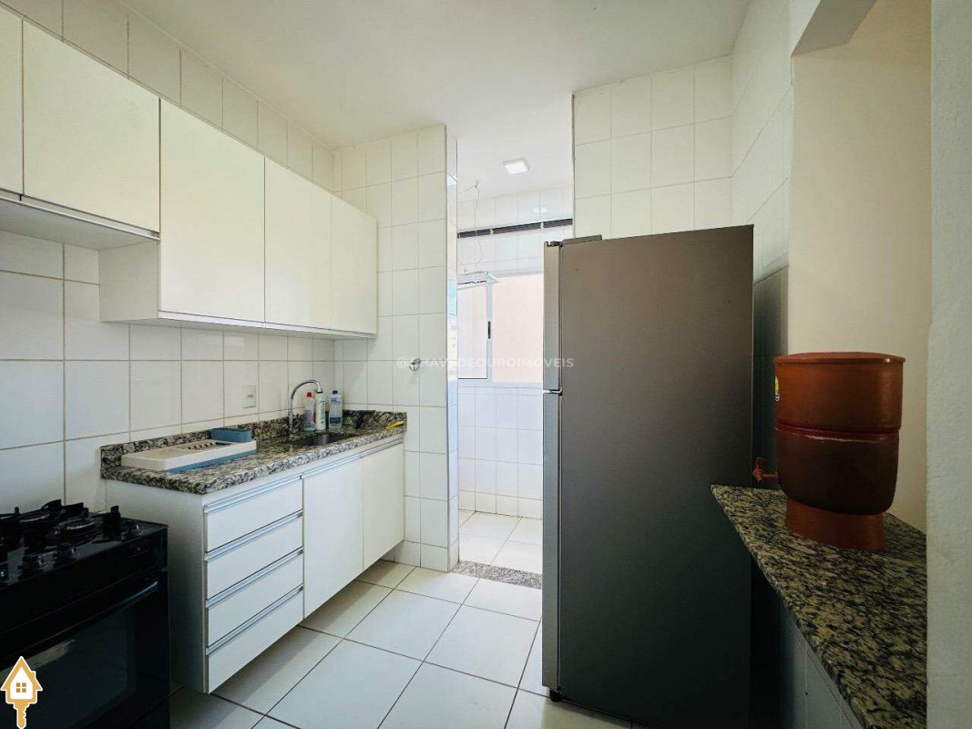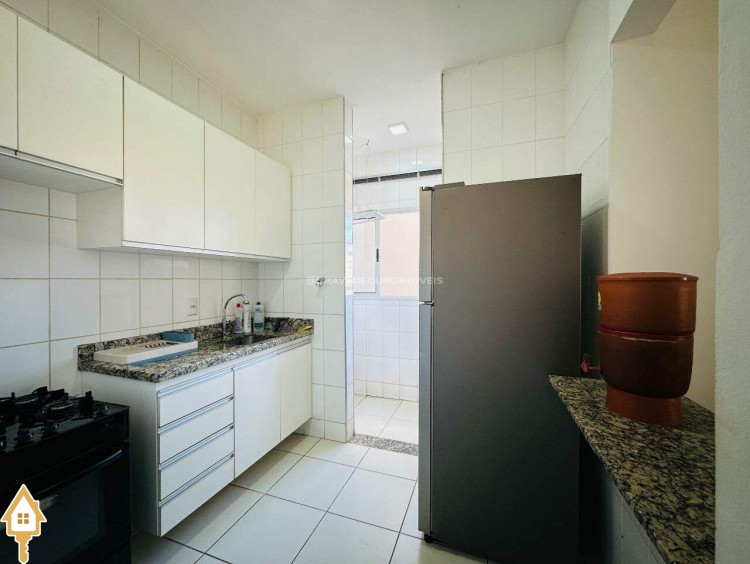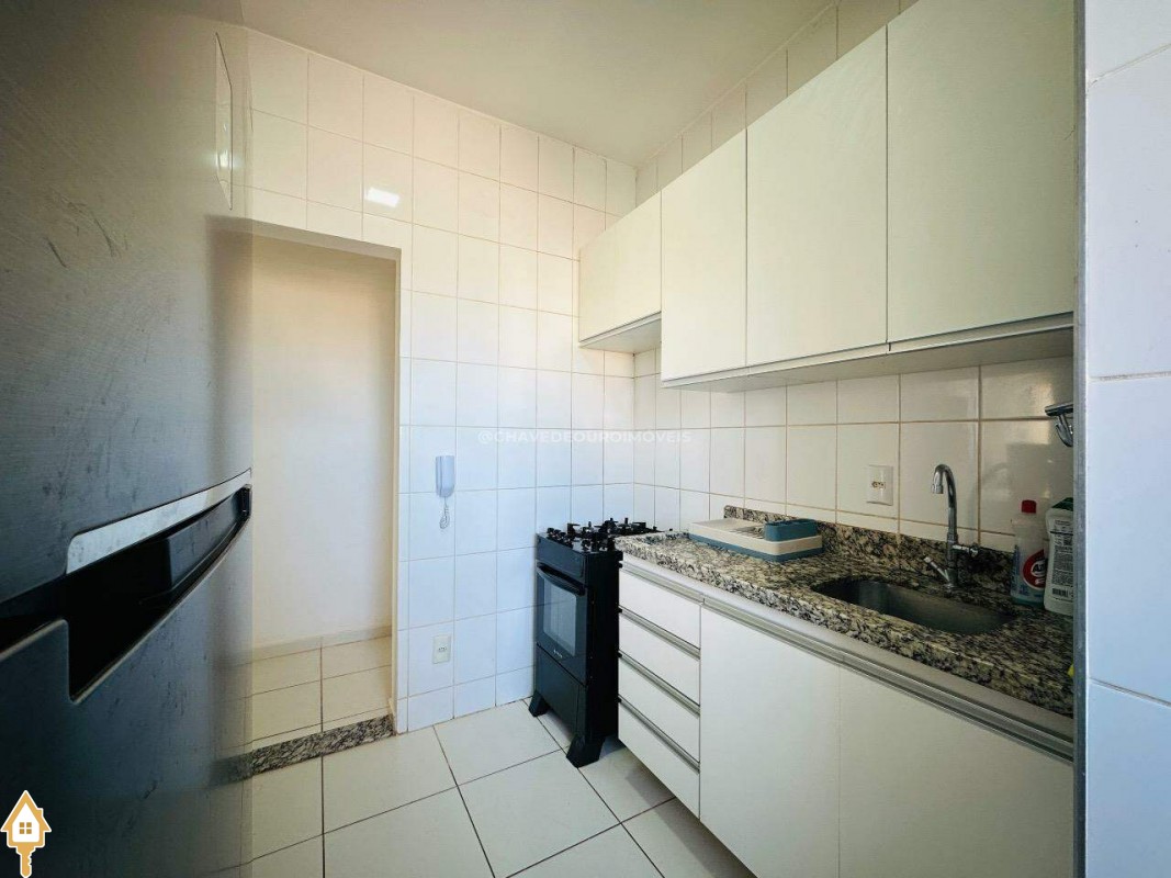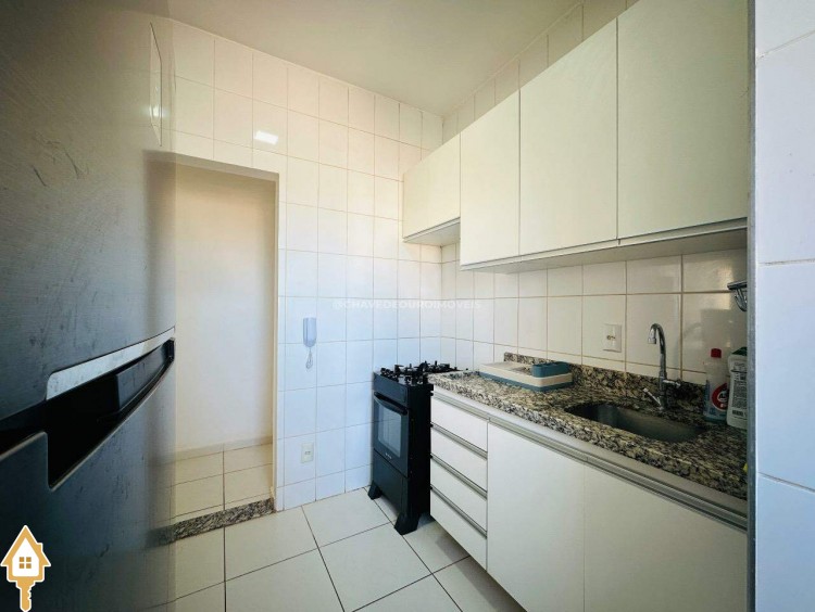 A cozinha planejada com armários garante funcionalidade no dia a dia, enquanto a área de serviço complementa a praticidade do ambiente. Além disso, o apartamento conta com interfone, portão eletrônico e uma vaga de garagem.