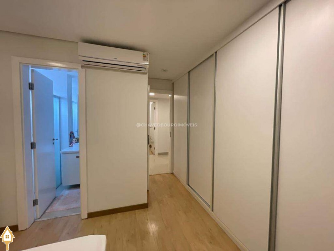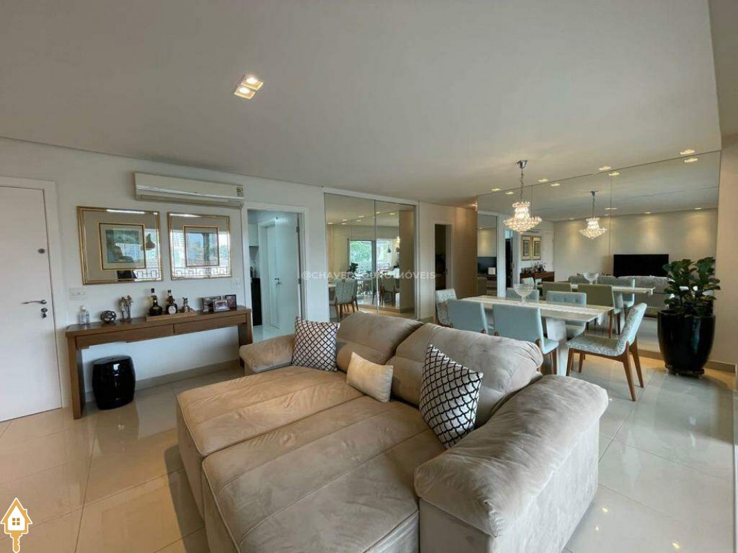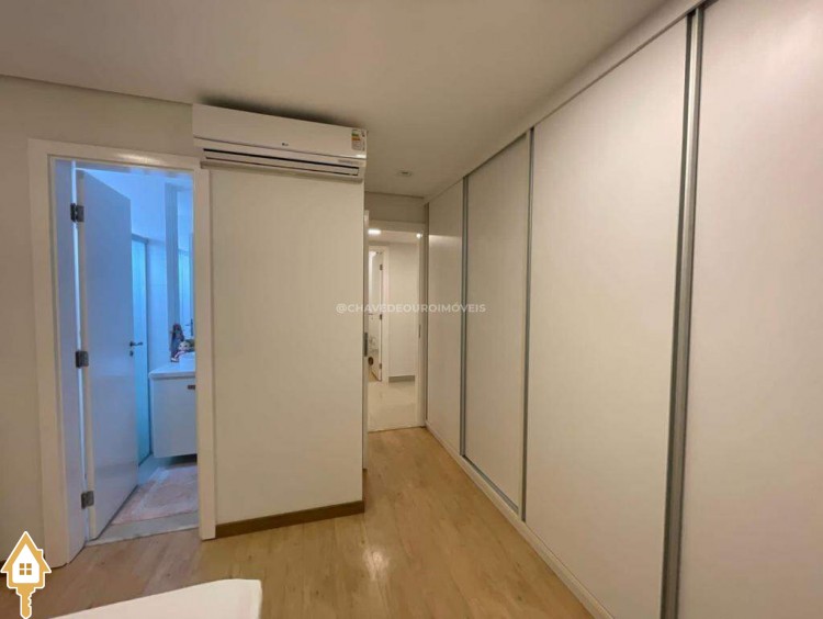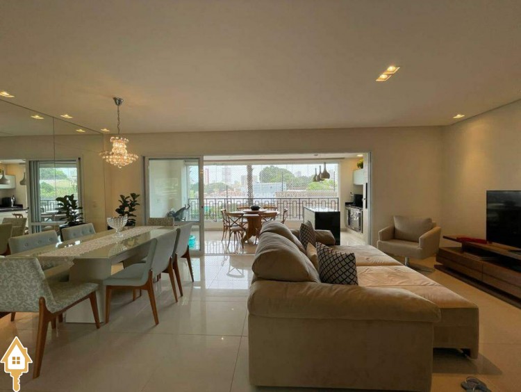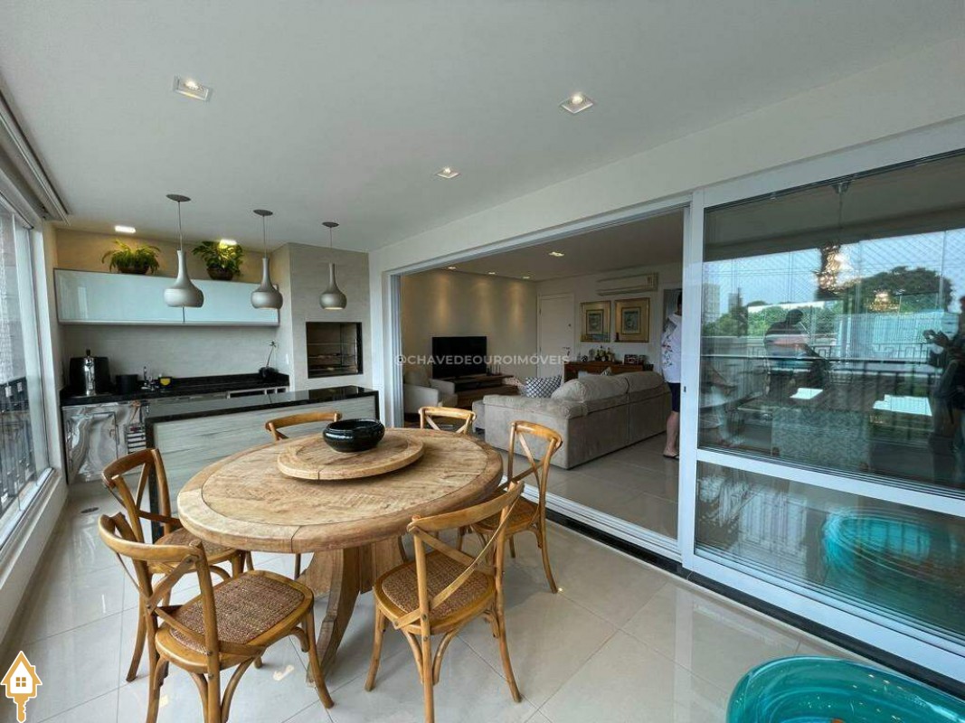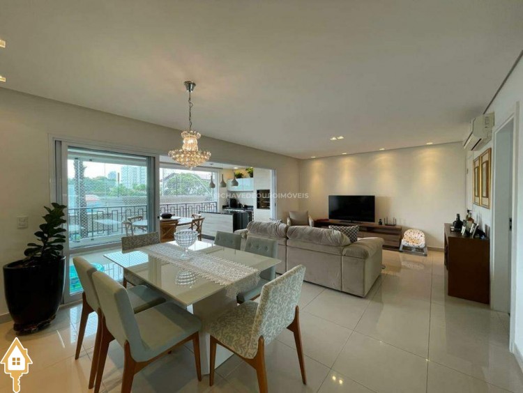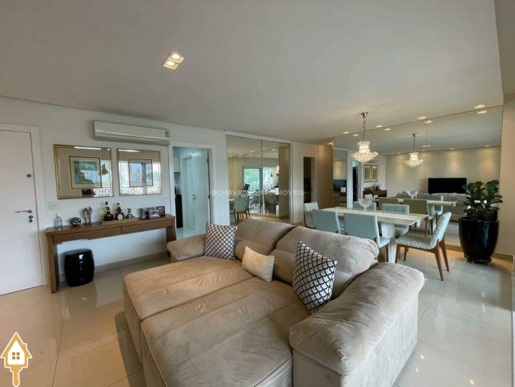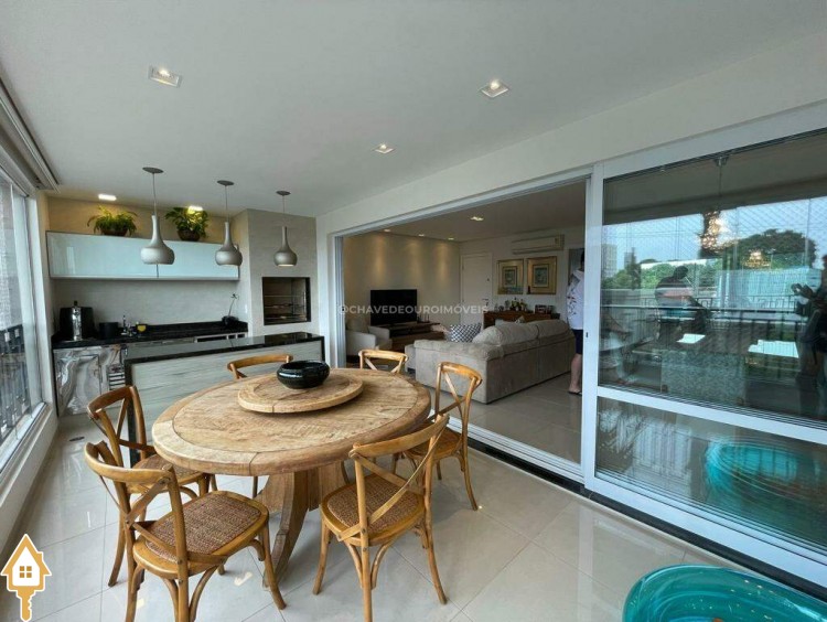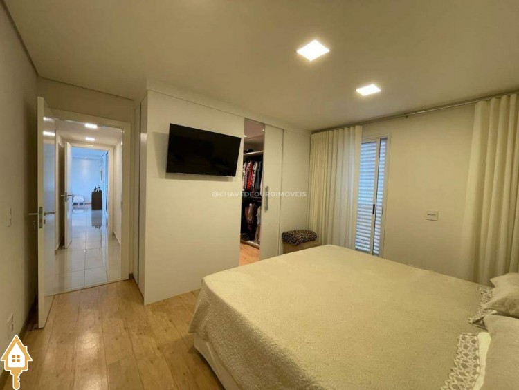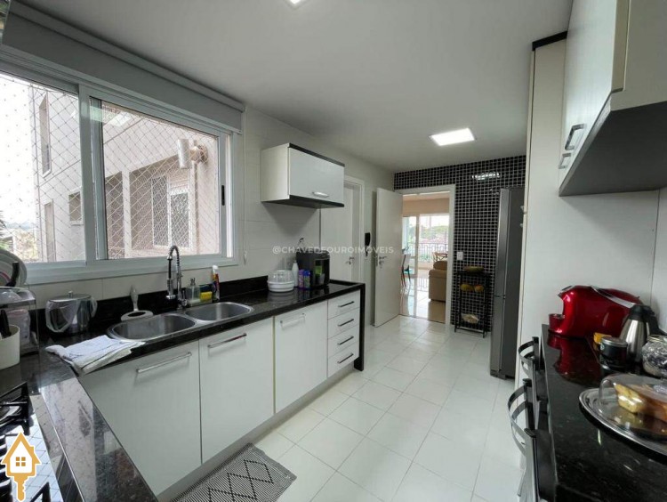 O apartamento também dispõe de lavabo, cozinha, área de serviço com banheiro e dois vagas de garagem cobertas. Todos os ambientes estão mobiliados com móveis planejados, garantindo funcionalidade e estética.