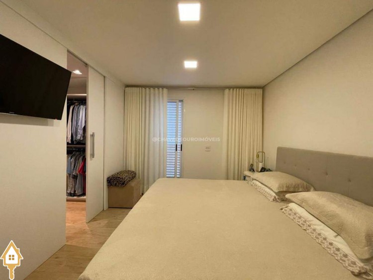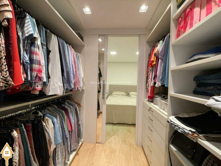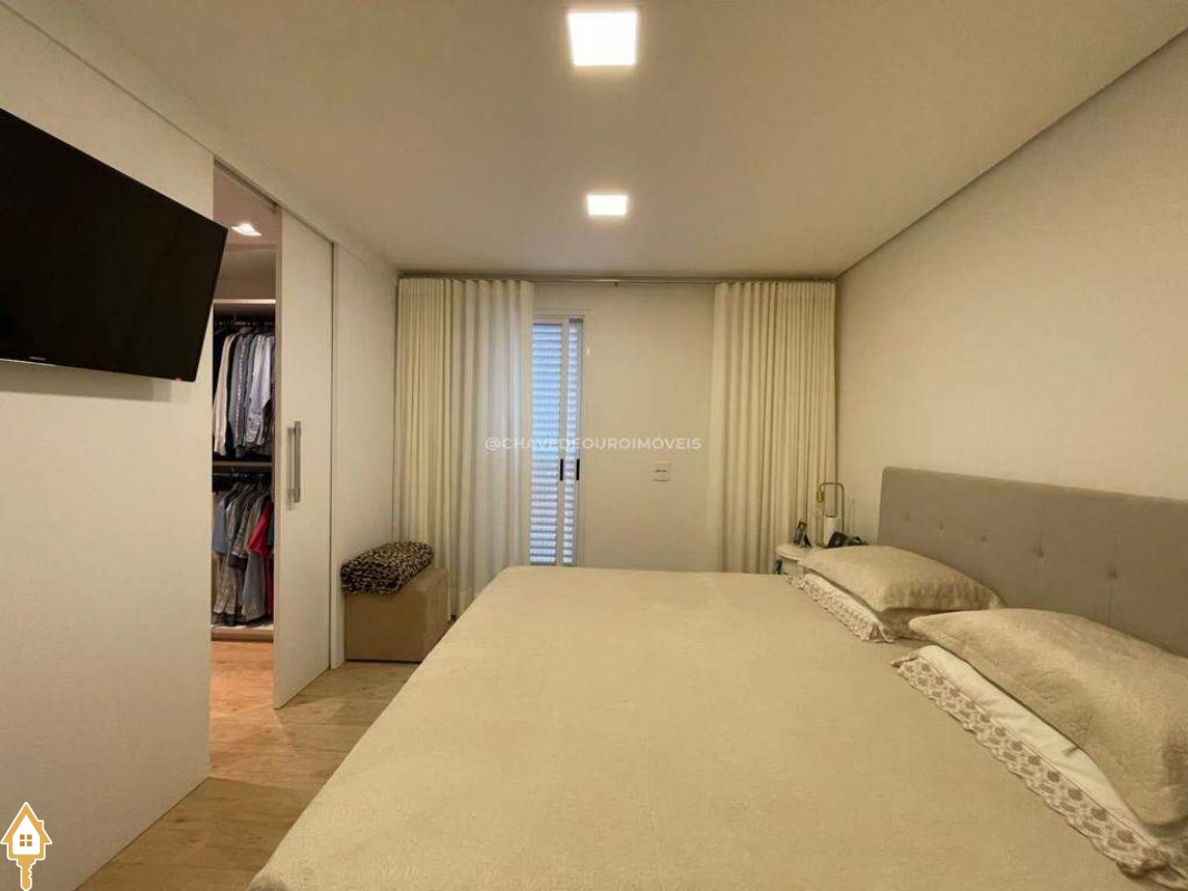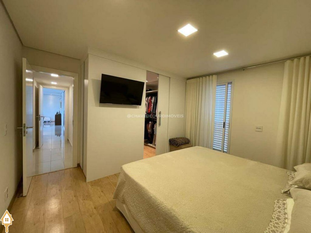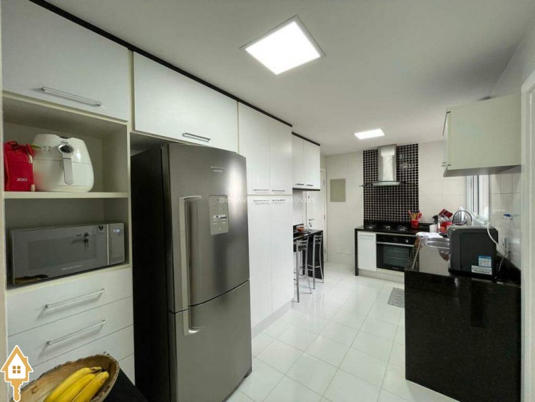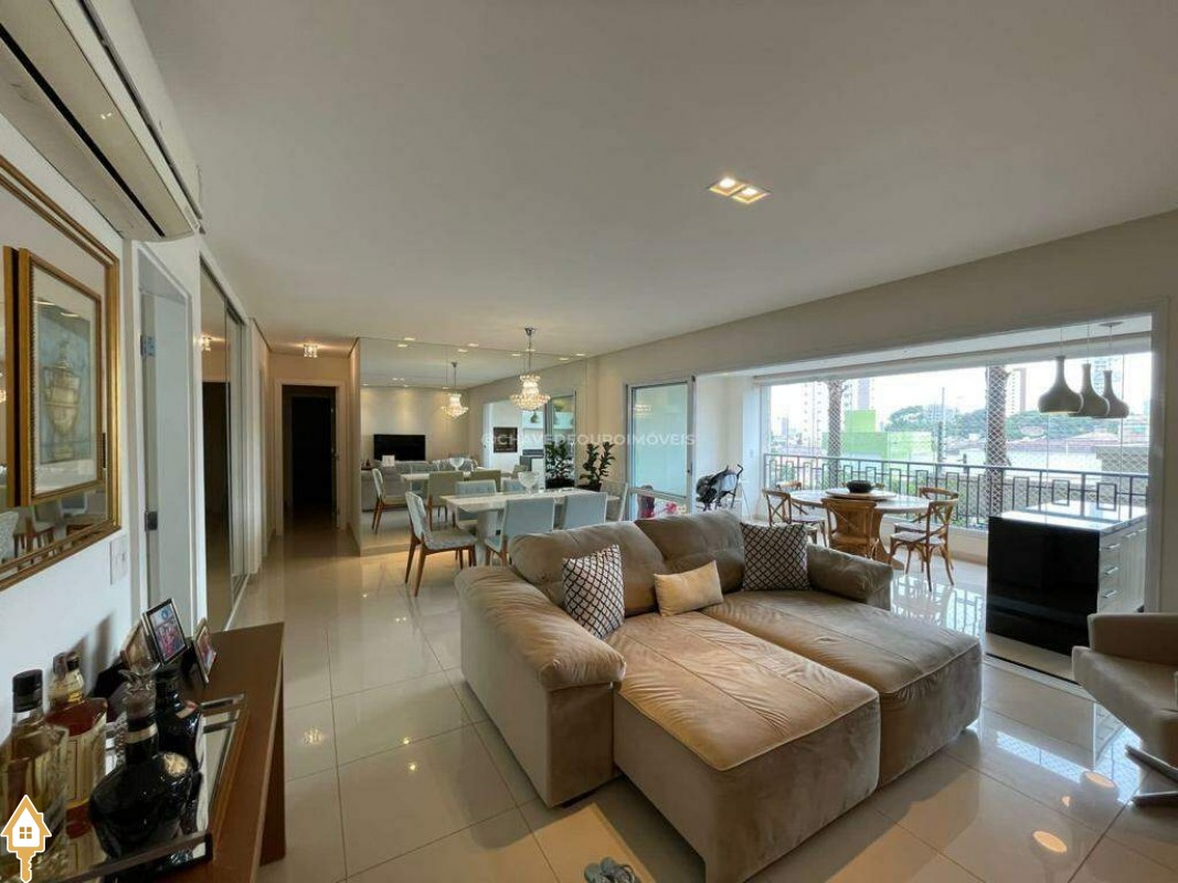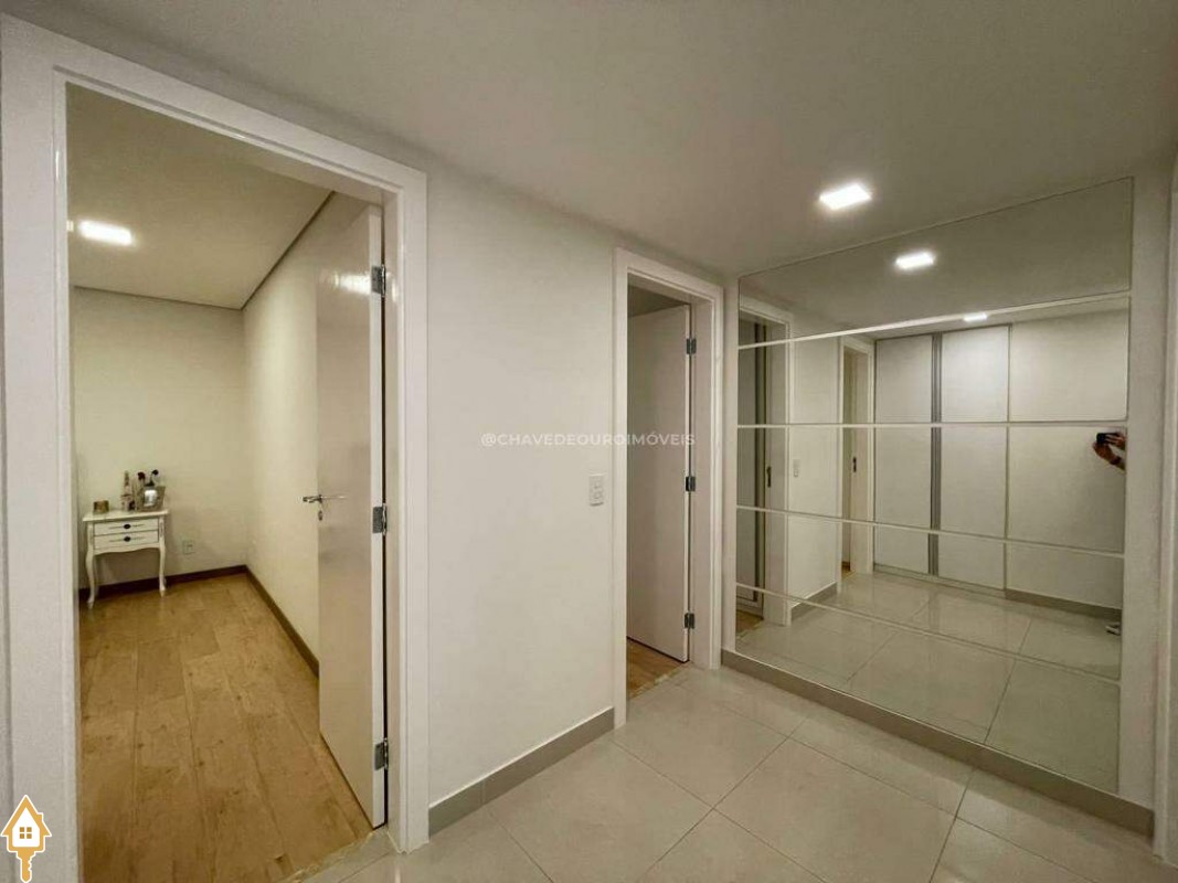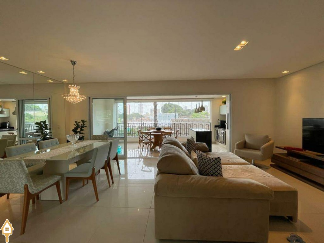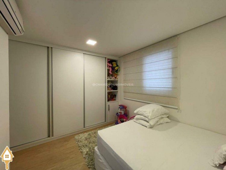 O apartamento também dispõe de lavabo, cozinha, área de serviço com banheiro e dois vagas de garagem cobertas. Todos os ambientes estão mobiliados com móveis planejados, garantindo funcionalidade e estética.