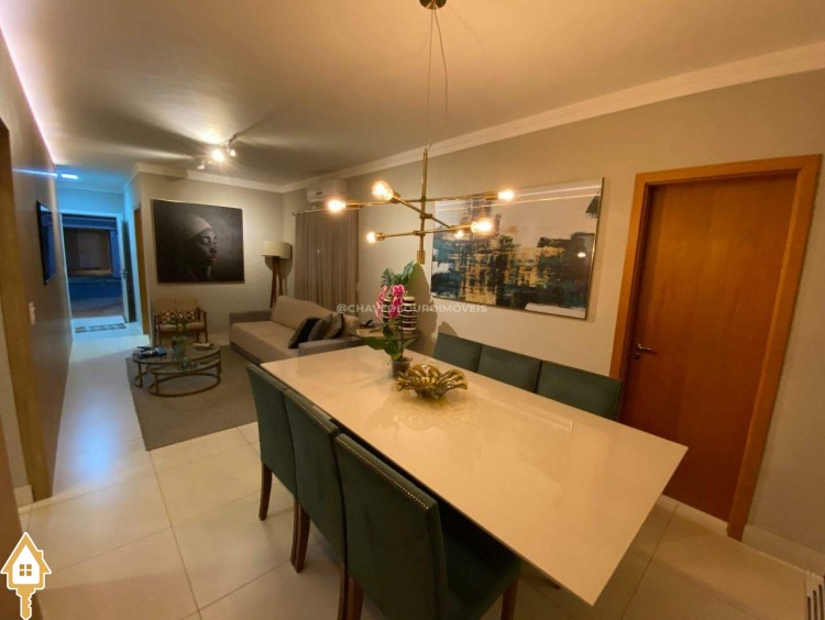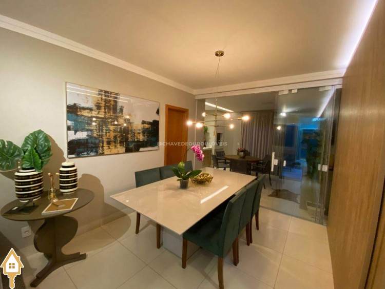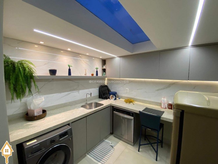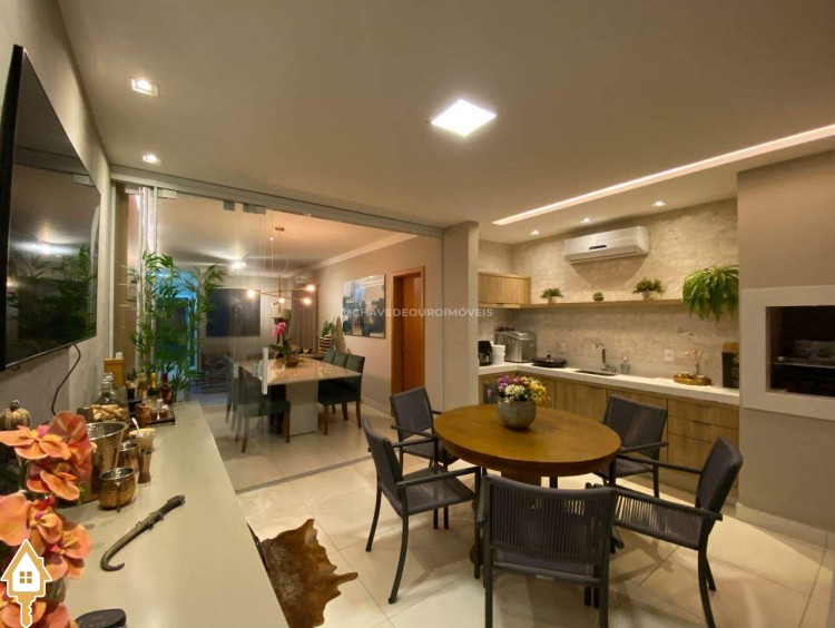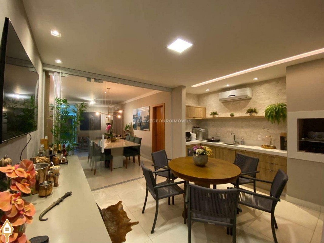 A sala para dois ambientes é espaçosa e convidativa, ideal para momentos de convívio. A cozinha planejada oferece praticidade e modernidade, enquanto o espaço gourmet com churrasqueira e lavabo é perfeito para receber amigos e familiares.