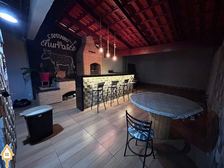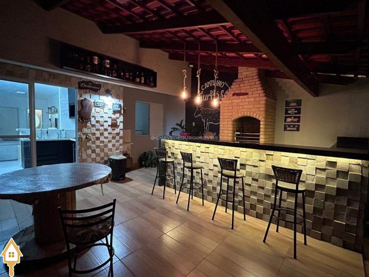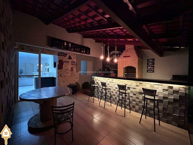 Área de lazer com churrasqueira e fogão à lenha de alvenaria, bancada em mármore, área de serviço.