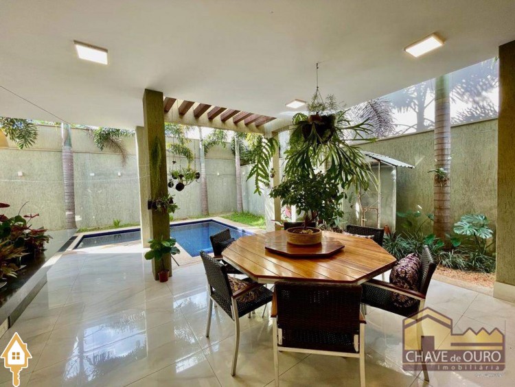 Casa Condomínio Damha II em Uberaba, MG. Composta por 3 suítes, sendo uma com closet. Sala para 3 ambientes, lavabo, cozinha planejada, lavanderia, banheiro de serviço, varanda gourmet com churrasqueira, lavabo externo, piscina aquecida e garagem para 4 carros.