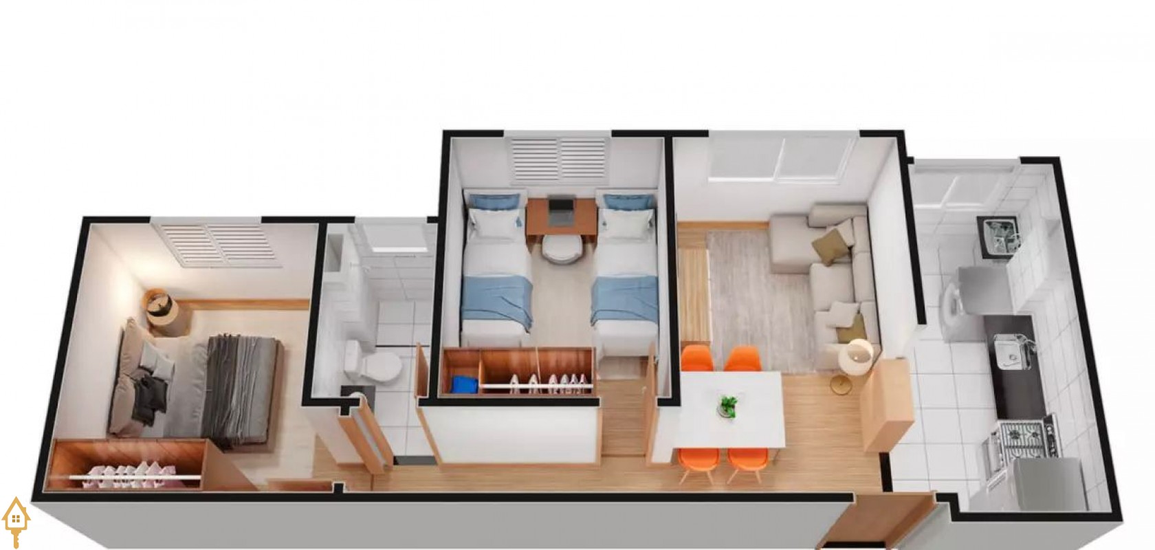 Apartamento com 2 quarto, Sala, Banheiro social, Cozinha integrada com a lavanderia e Garagem