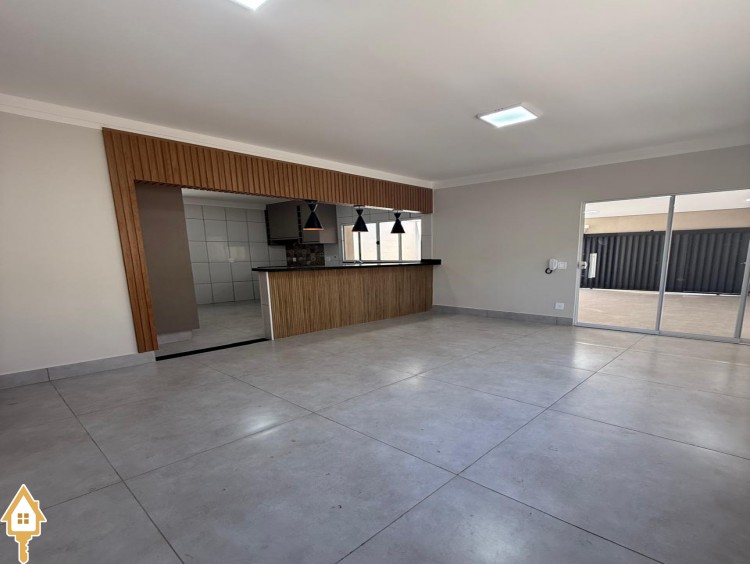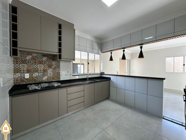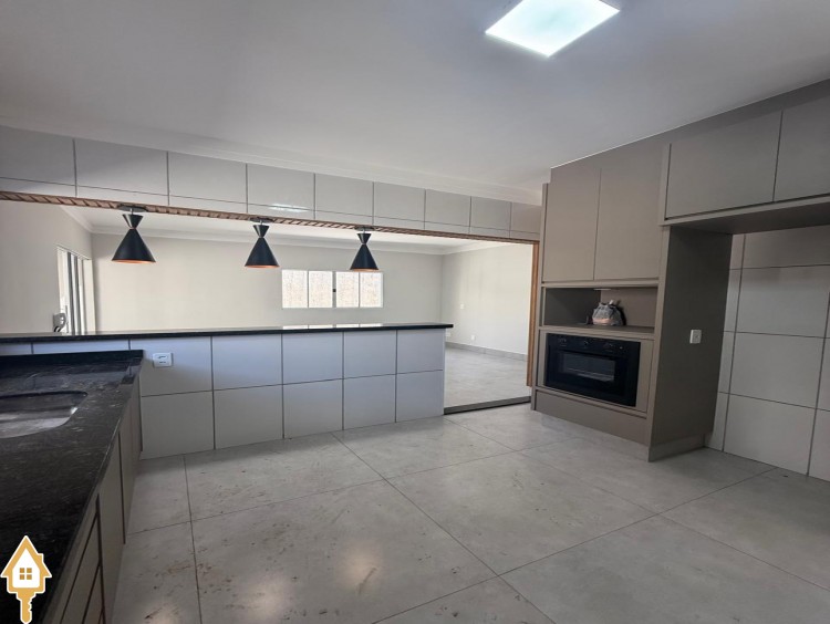 Cozinha Americana equipada com armários planejados, forno embutido, cooktop e bancada moderna;