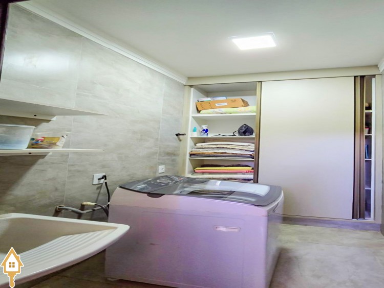 Sala de TV conjugada com Sala de Jantar equipada com lustres, ar condicionado e cortinas;