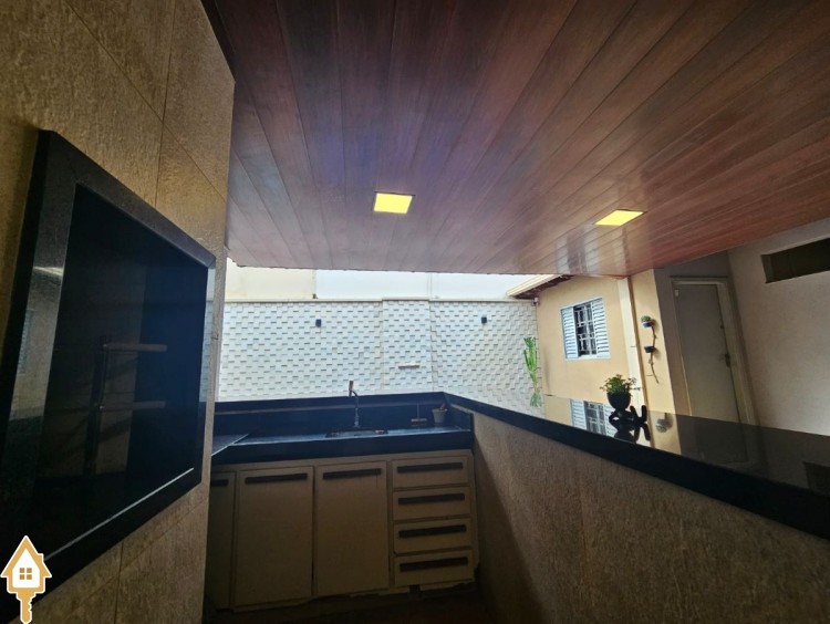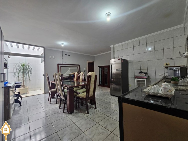 Em terreno de 300 m², a casa oferece 212 m² de área construída, com ambientes bem distribuídos e funcionais. A área social conta com sala de TV, cozinha ampla com claraboia — que favorece iluminação natural — e integração prática com a lavanderia coberta e o espaço de apoio.