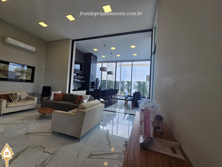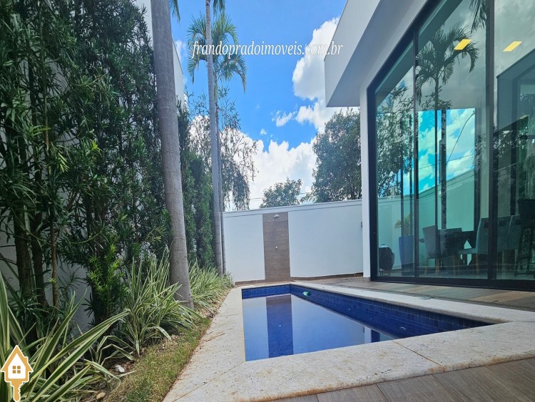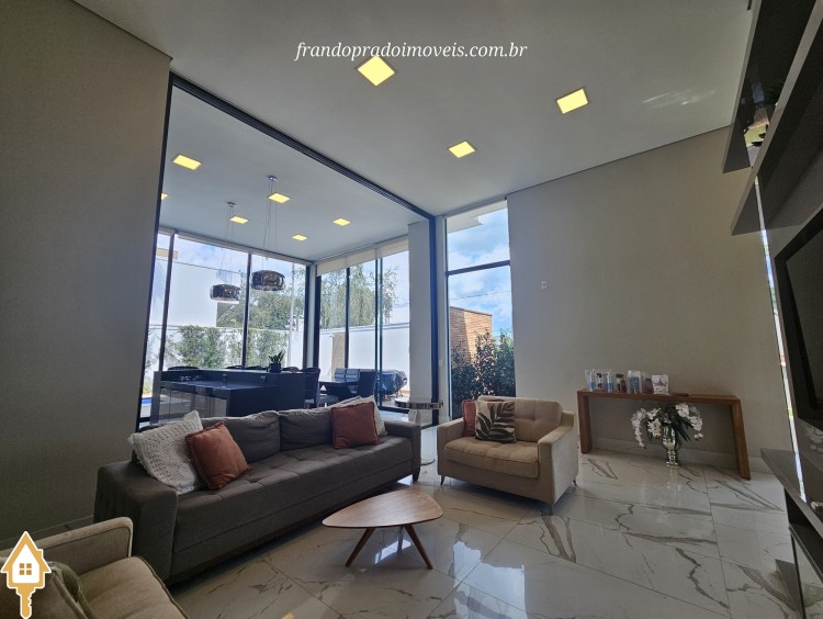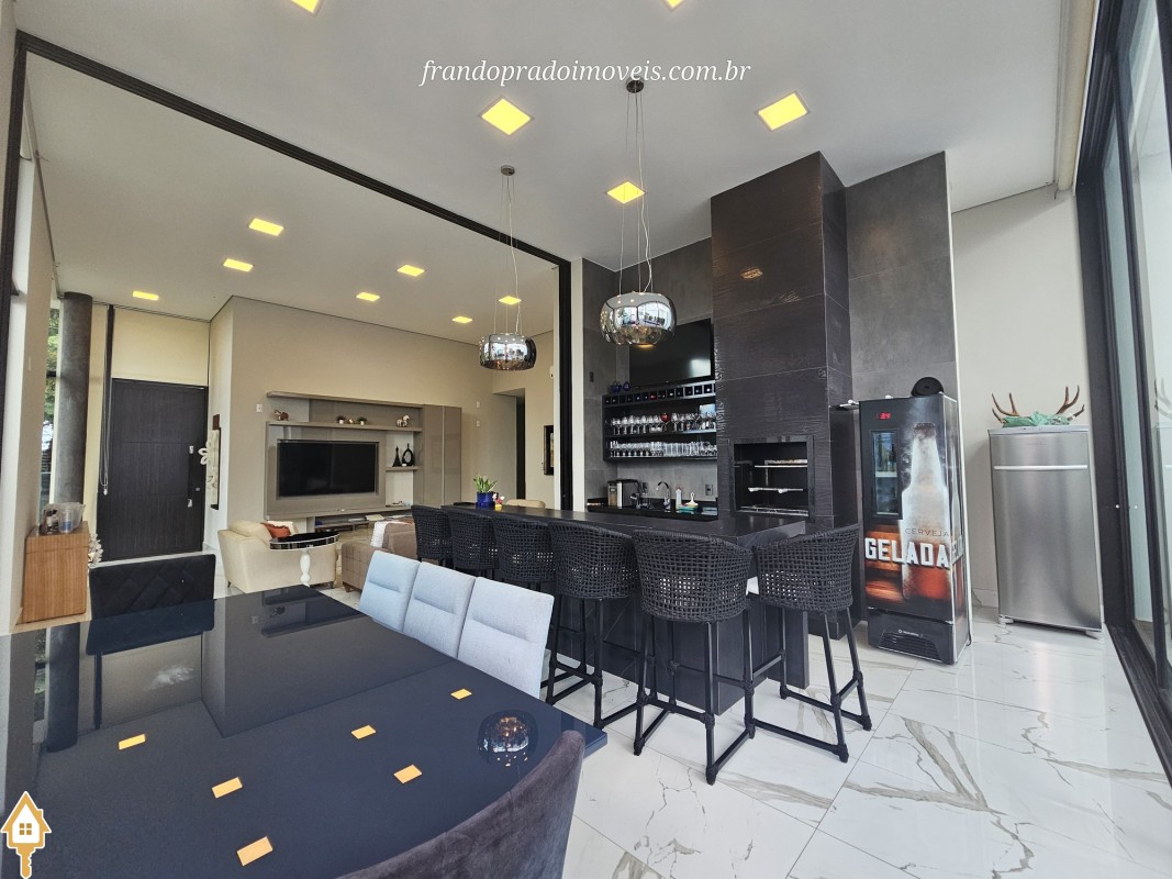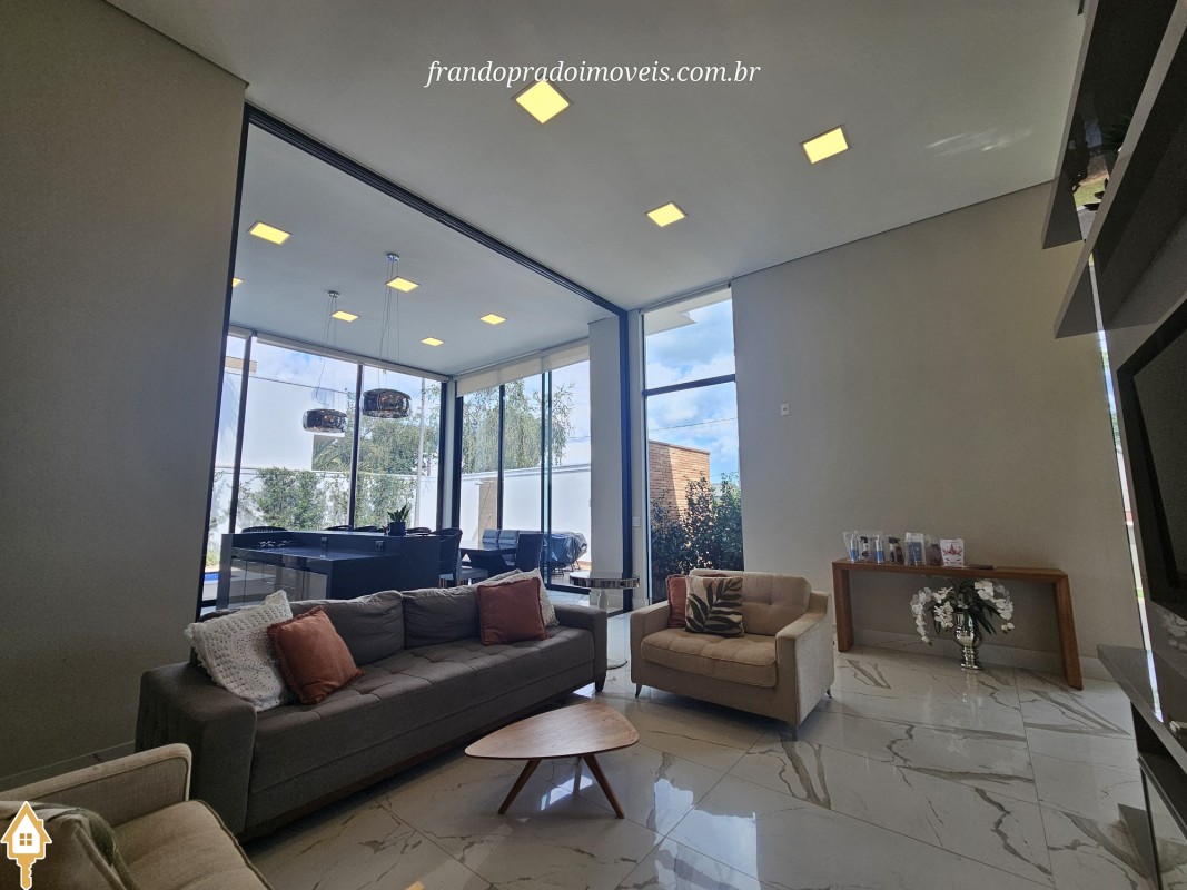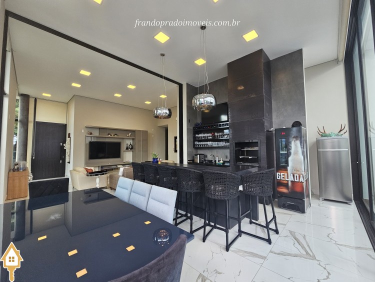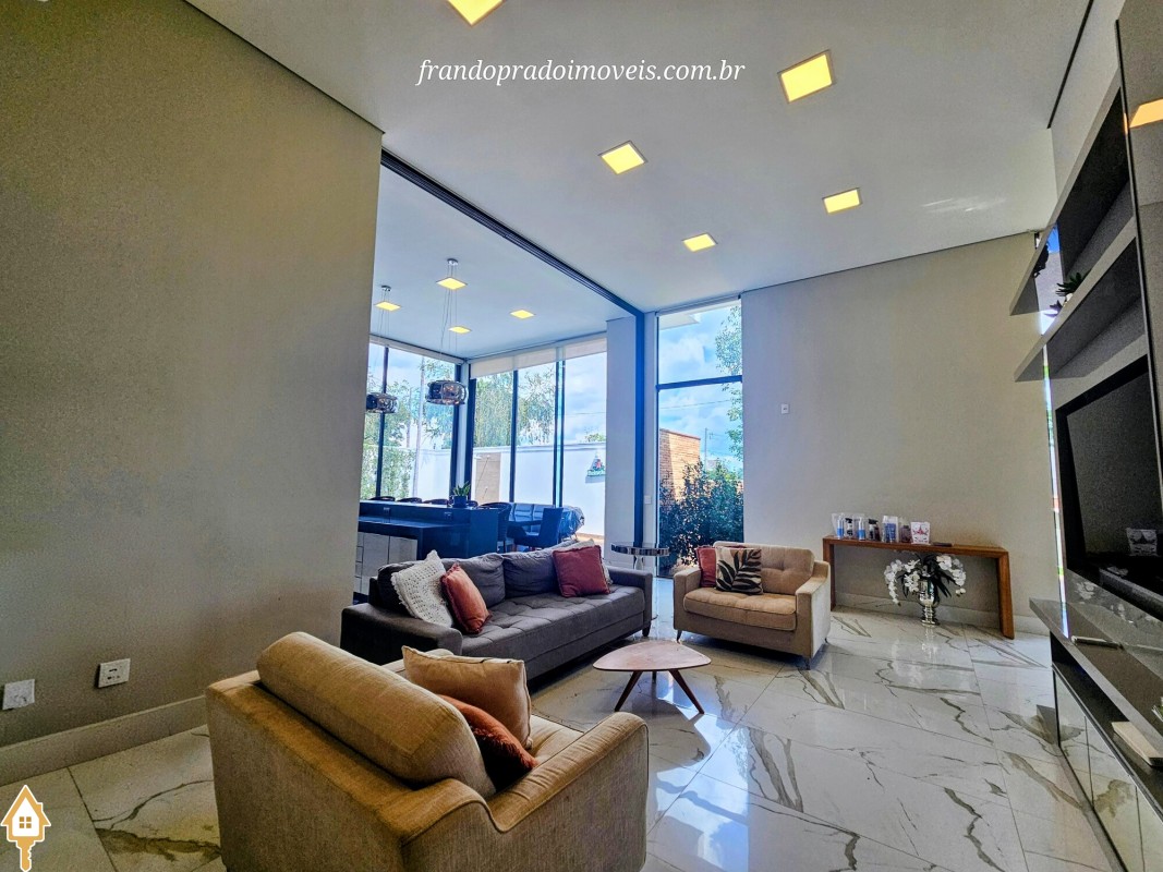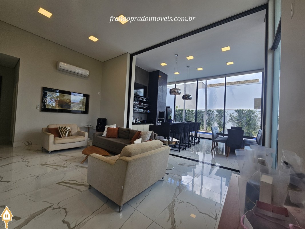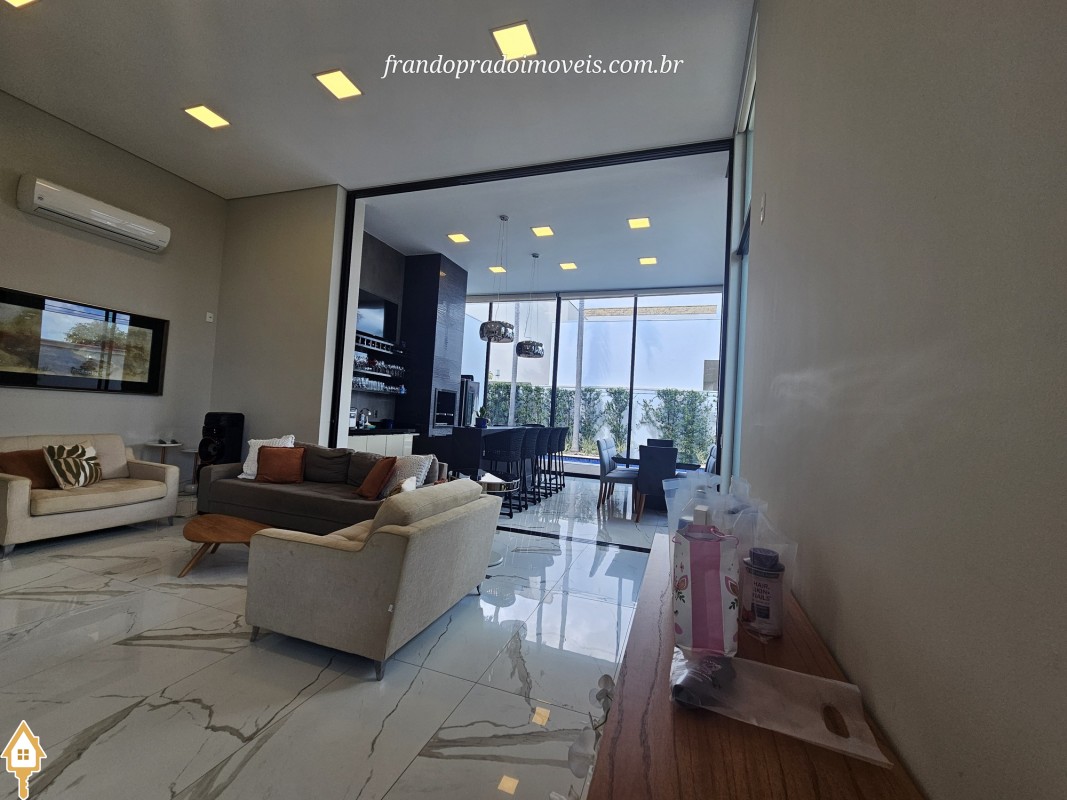 Casa à venda em condomínio em Uberaba. Imóvel com projeto funcional e ambientes integrados, oferecendo sala para dois ambientes conectada à varanda gourmet por portas-cortina, permitindo integração com a área externa e a piscina aquecida. Possui três suítes privativas, cozinha planejada, banheiro de apoio, área de serviço com entrada independente e ambientes planejados. Conta ainda com ar-condicionado nos quartos e sala, energia fotovoltaica e projeto de iluminação. Boa ventilação e iluminação naturais e posição privilegiada, sem vizinho em frente.