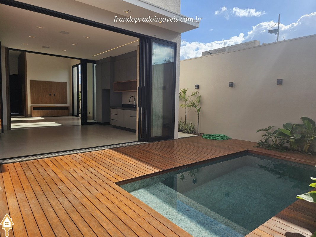 A área social integra sala com pé-direito alto, cozinha planejada e espaço gourmet amplo e funcional. São 3 suítes, sendo a principal com closet, além de escritório com esquadria automatizada e lavabo.