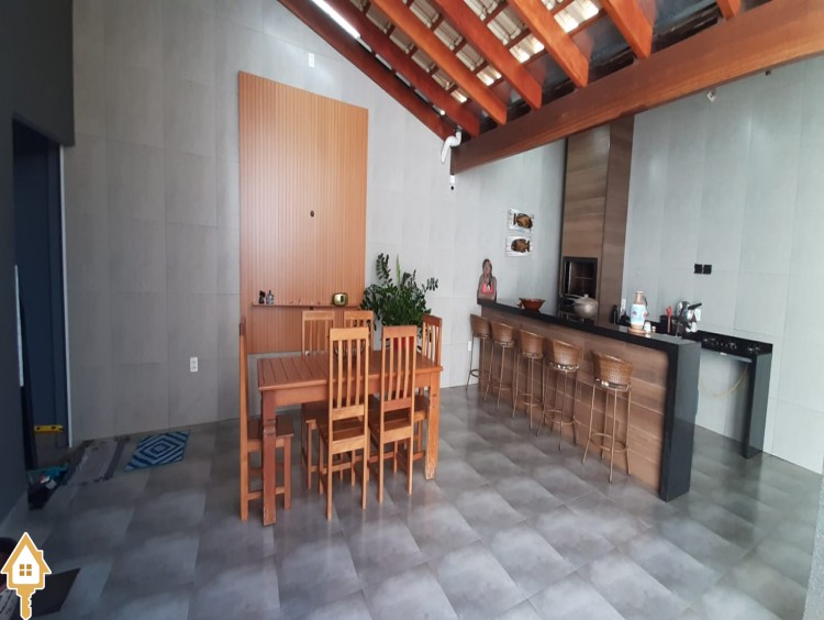 Casa composta de sala ampla, com painel e ar condicionado de 12.000 btus, 2 quartos confortáveis, sendo 1 suíte com armários planejados e 2 ares condicionados de 9.000 btus, cozinha planejada com copa anexada, banheiro social, varanda gourmet ampla e arejada com churrasqueira, bancada em granito e painel, quarto externo, lavabo, quintal cimentado com ducha, garagem para 4 carros, sendo 3 cobertos, área de serviço externa, coberta, energia fotovoltaica com 10 placas solares.