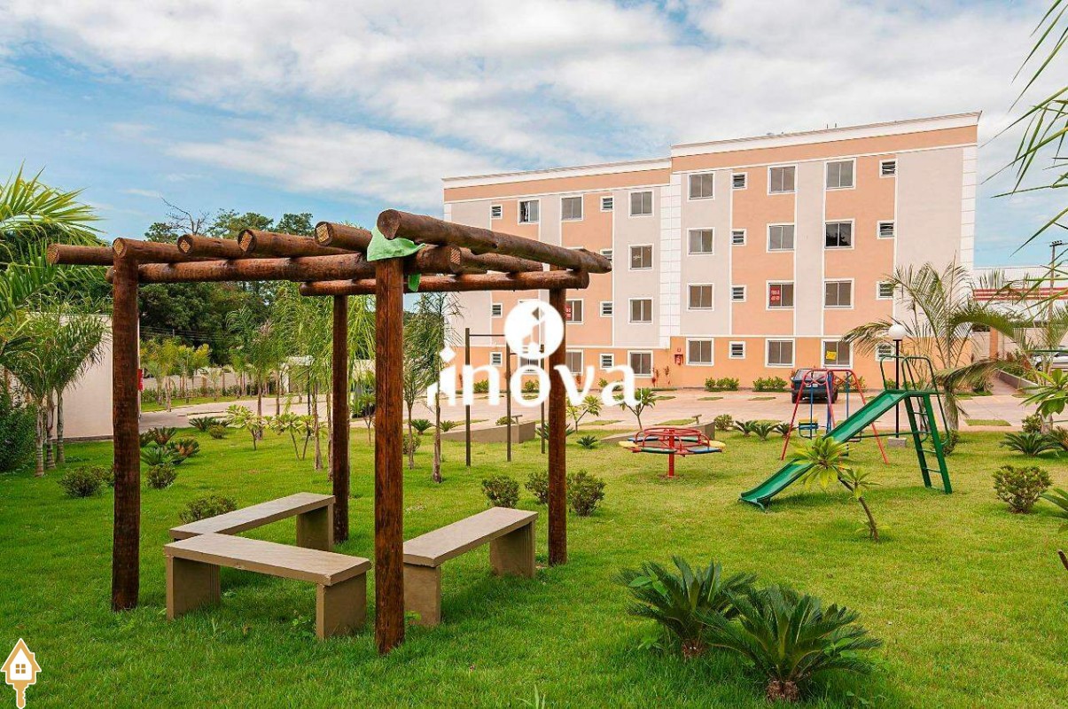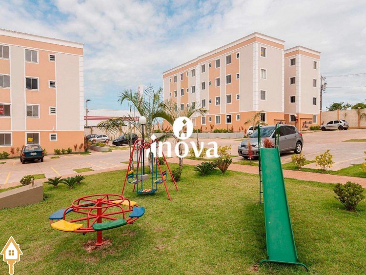 Condomínio fechado, com portaria 24h, área externa com piscina, playground e área gourmet com mesas e churrasqueira.