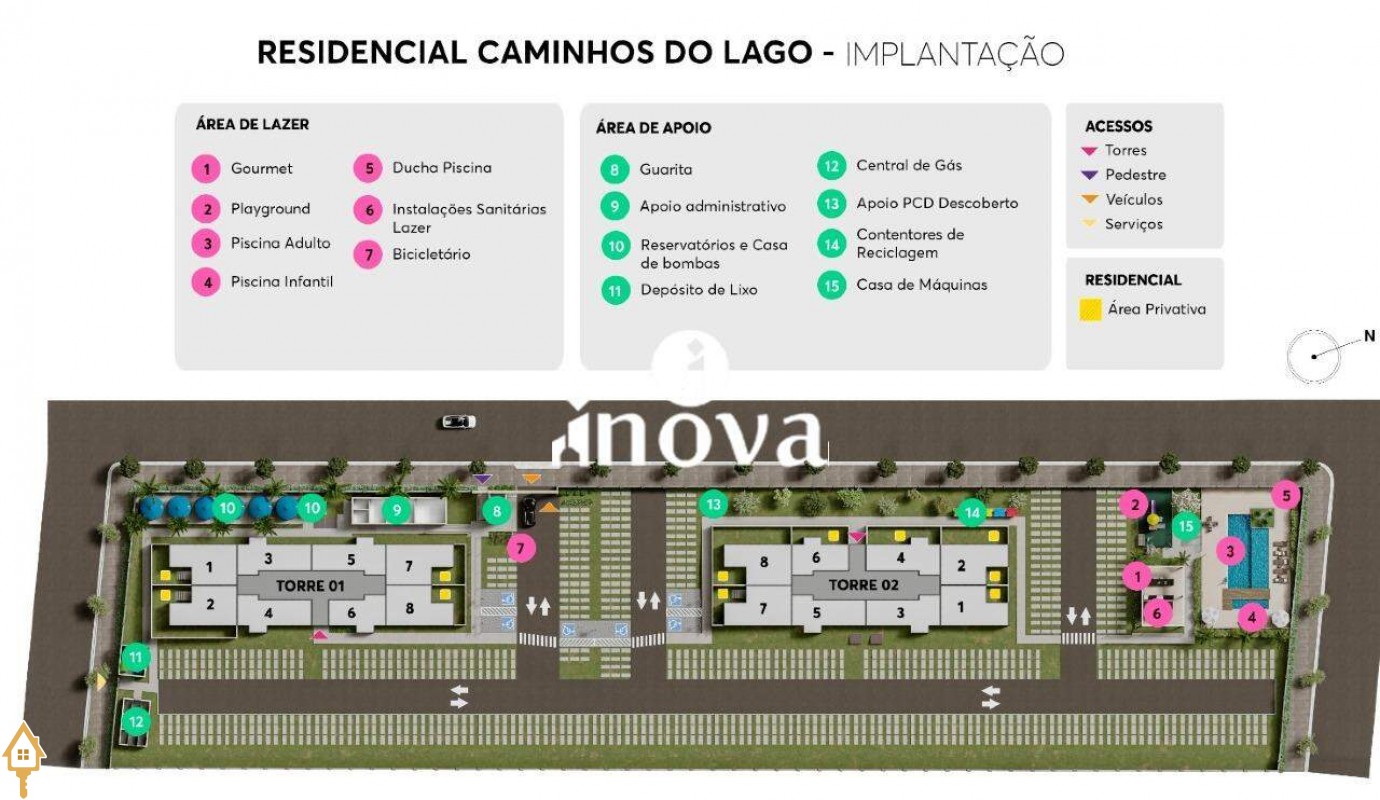 Condomínio com bicicletário, célula de segurança para pedestre, célula de segurança para pedestre, circuito fechado de TV, circuito fechado de TV, coleta seletiva, elevador, espaço Gourmet, lazer equipado, luminária com sensor de presença na guarita, piscina Adulto, piscina Infantil, playground, previsão para wi-fi nas áreas de lazer.