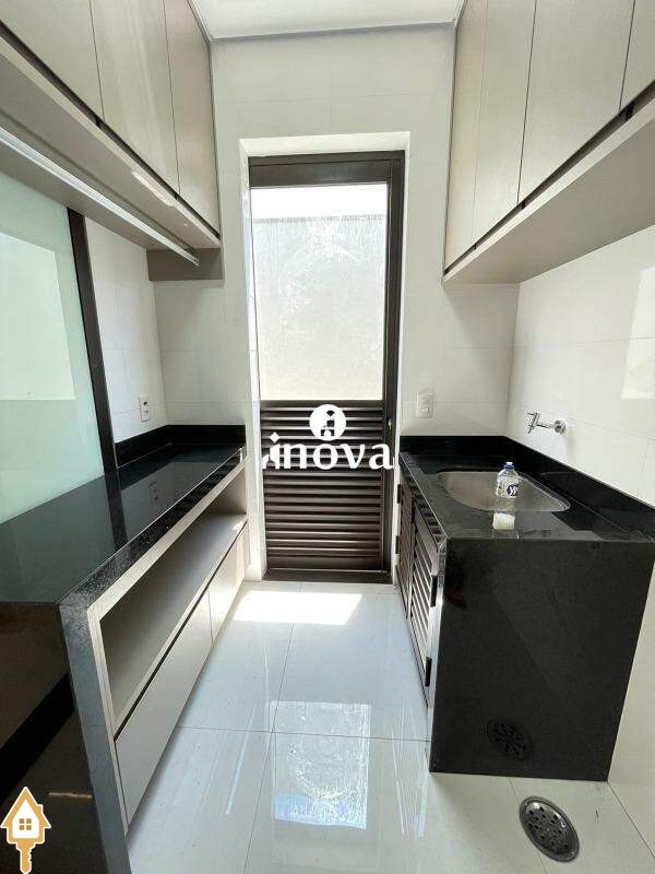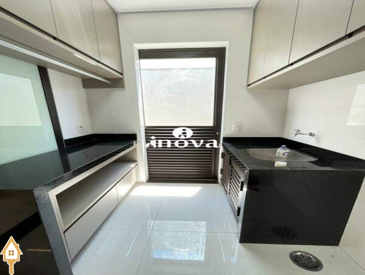 - Cozinha com armários, bancada para refeições, coifa, cooktop e torre quente;