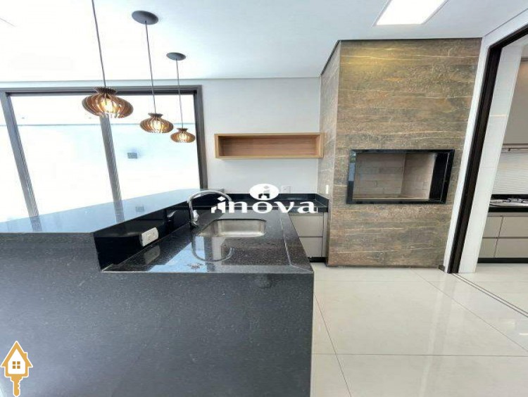 - Varanda gourmet com churrasqueira armário e painel de TV;
