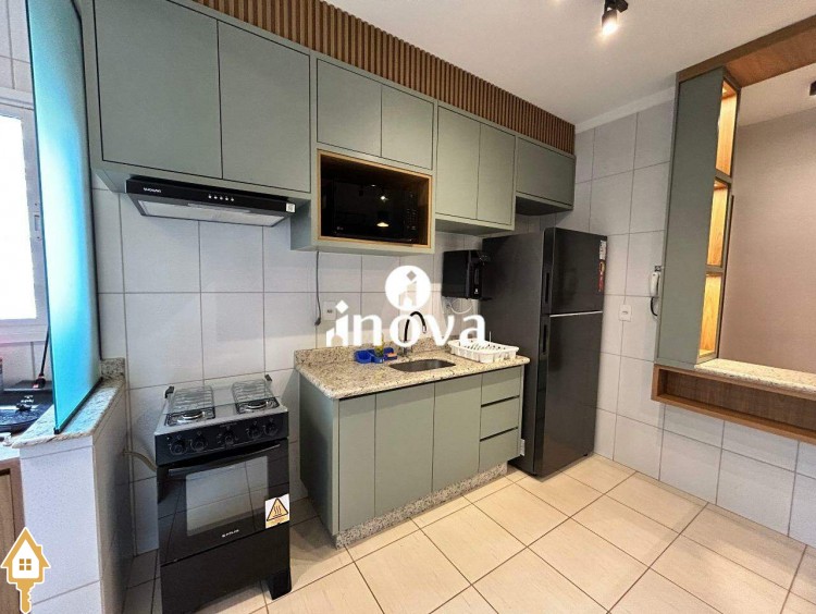 - Cozinha estilo americana com balcão, armários, nichos, fogão, sugar, filtro, micro-ondas e geladeira;