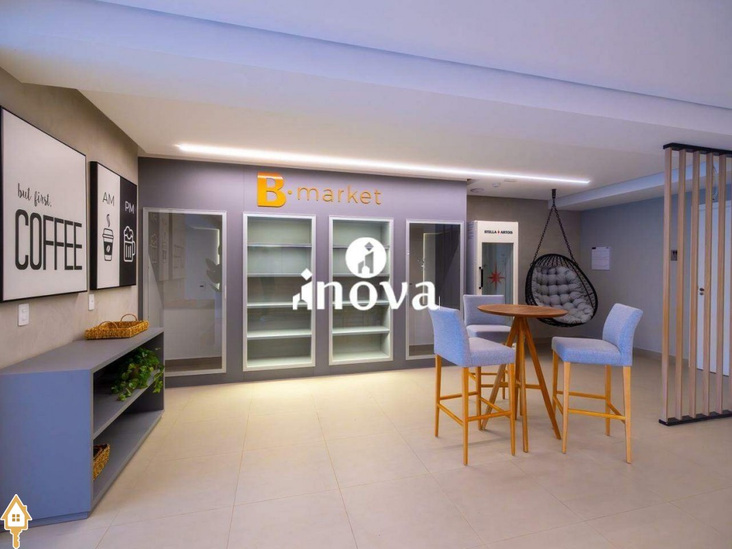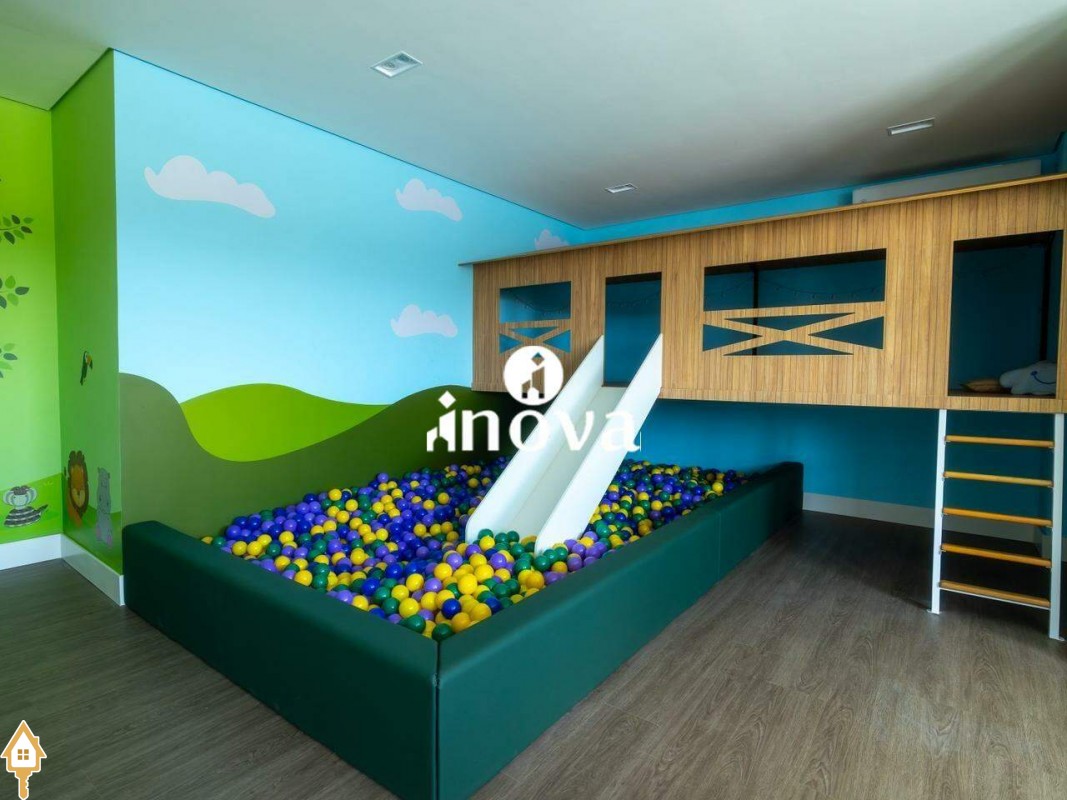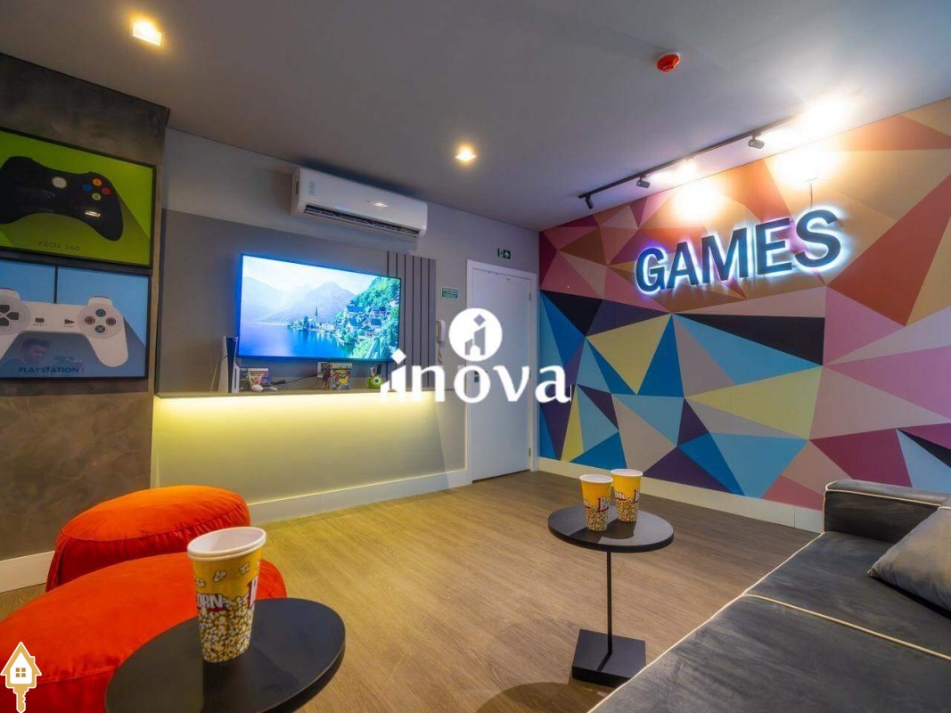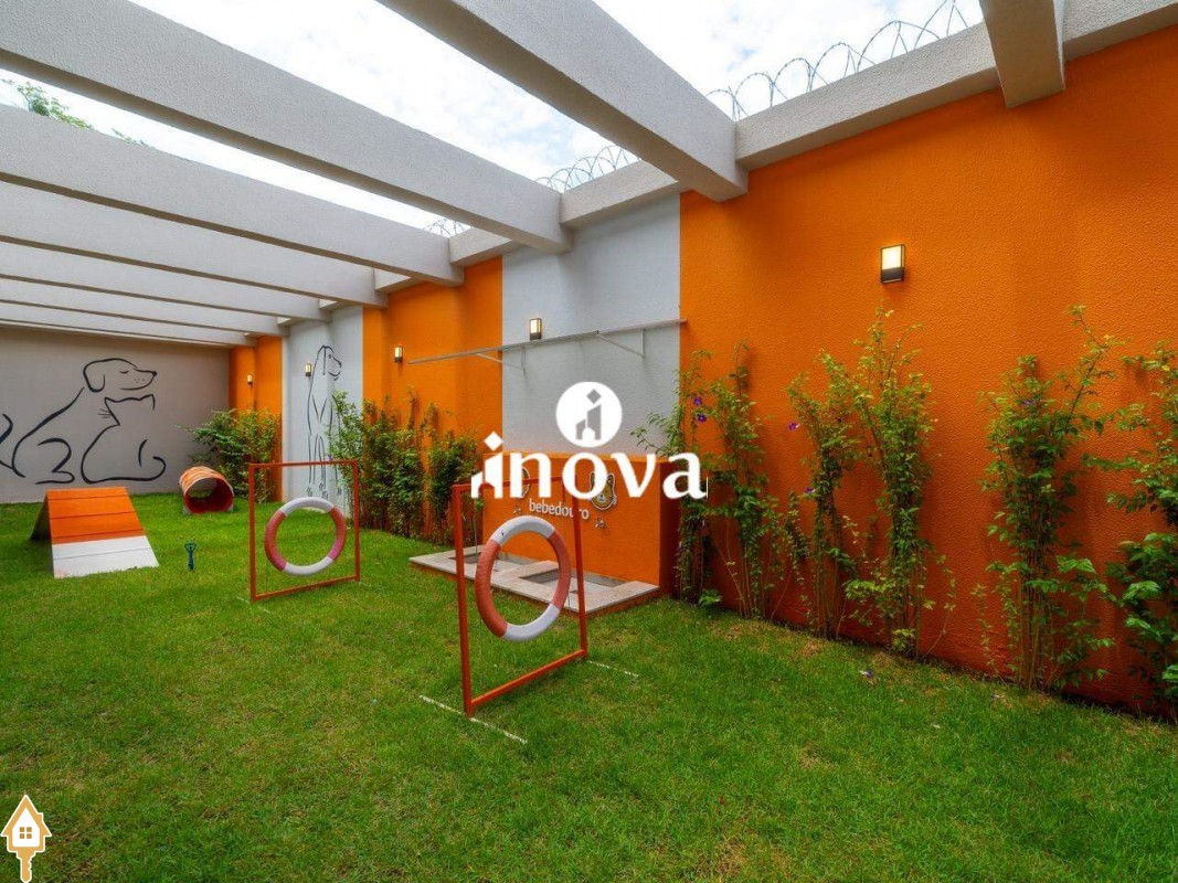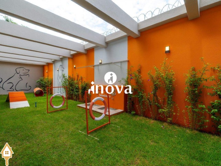 Prédio com elevador, piscina, espaço gourmet, academia, quadra, playground e área para pets.