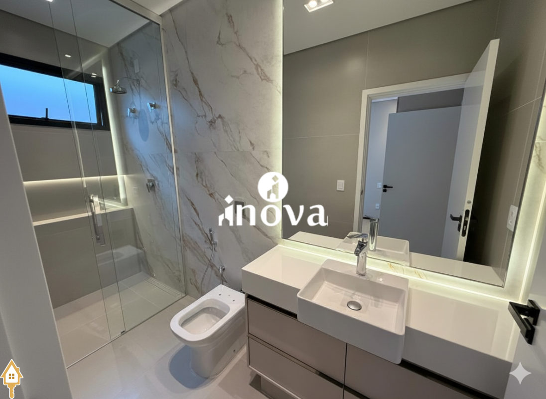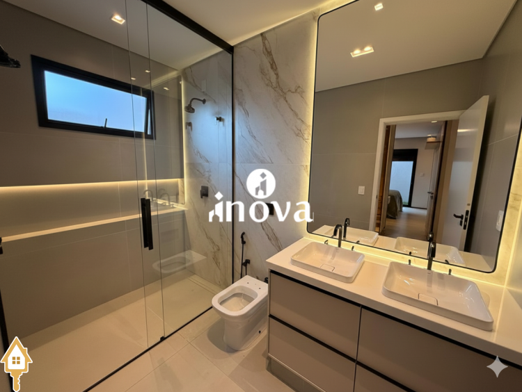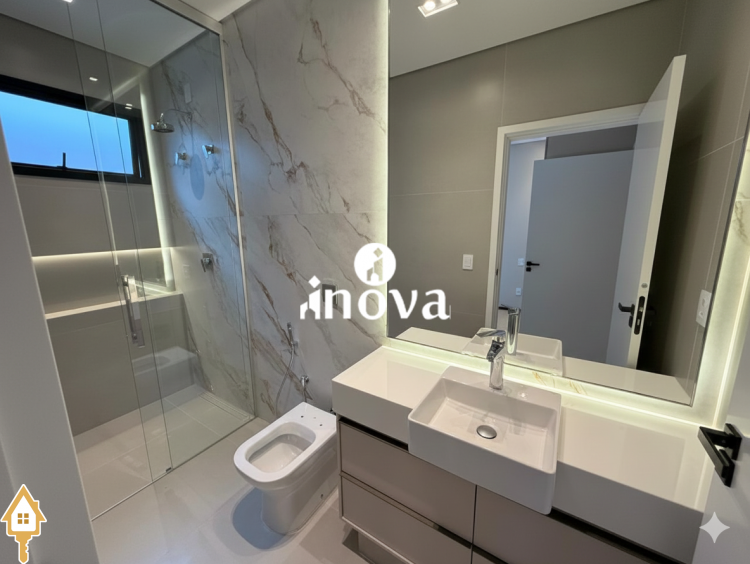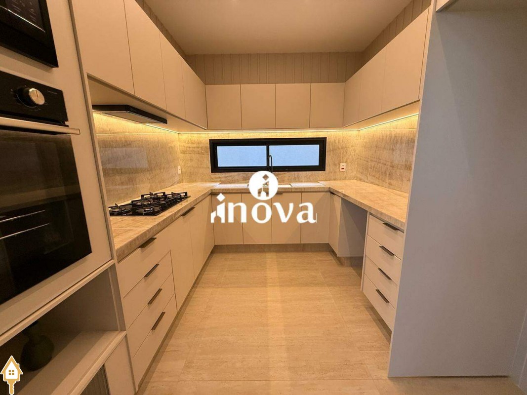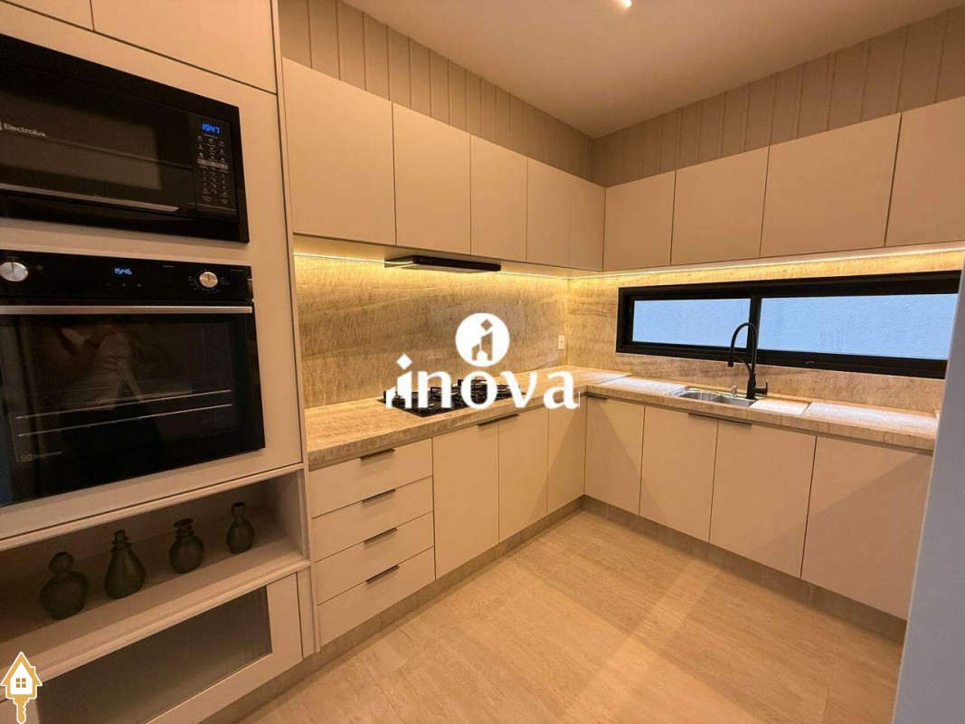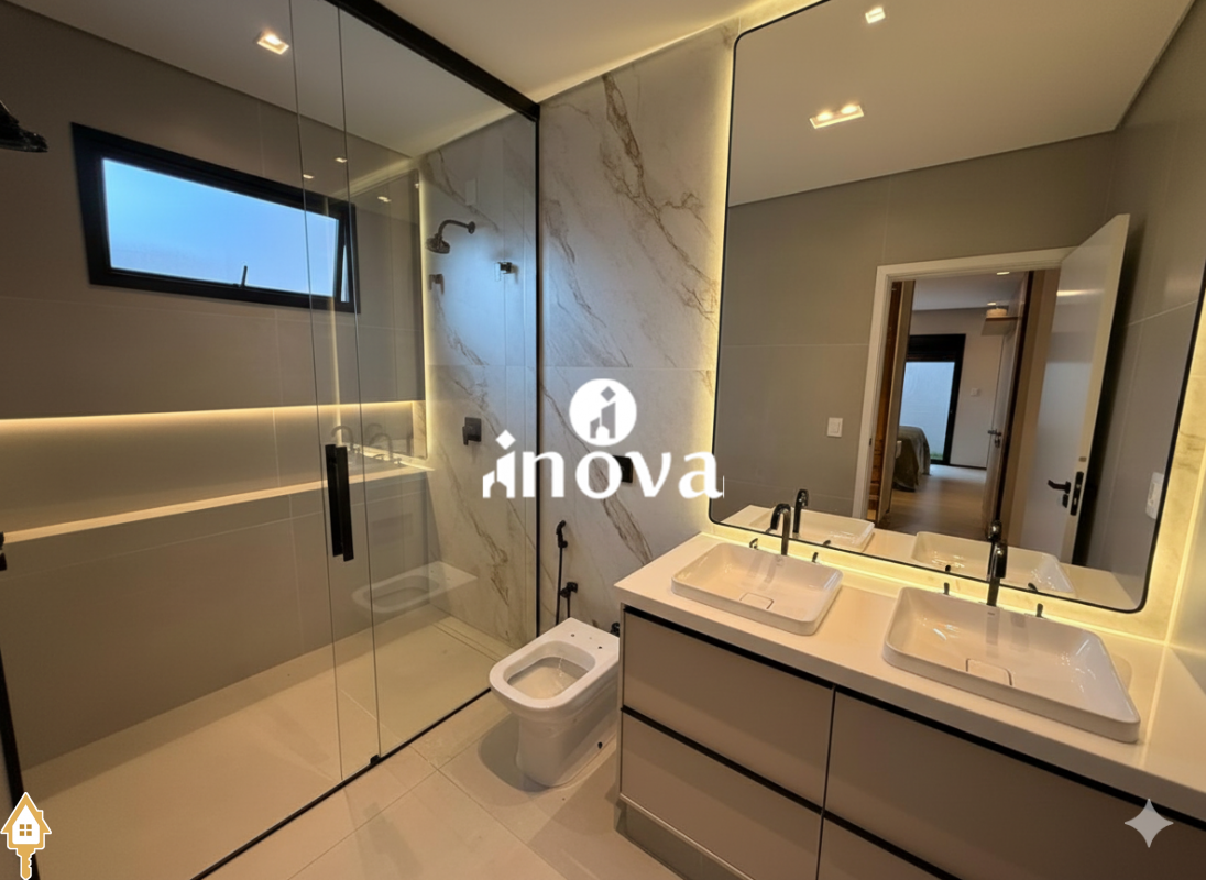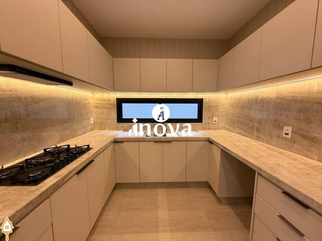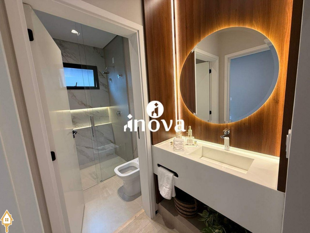 Casa como Iluminação em led, sistema de aquecimento solar com boiler de 800 litros, esquadrias de alumínio com portas com persianas automáticas nas suítes , ar condicionado (nas suítes, escritório, sala de jantar e estar e área gourmet), móveis planejados, pisos e revestimentos de altão padrão, fachada em pedra Espanha, bancadas e balcões em quartzo Taj Mahal, lavatório em nano glass, metais e louças de alta qualidade.