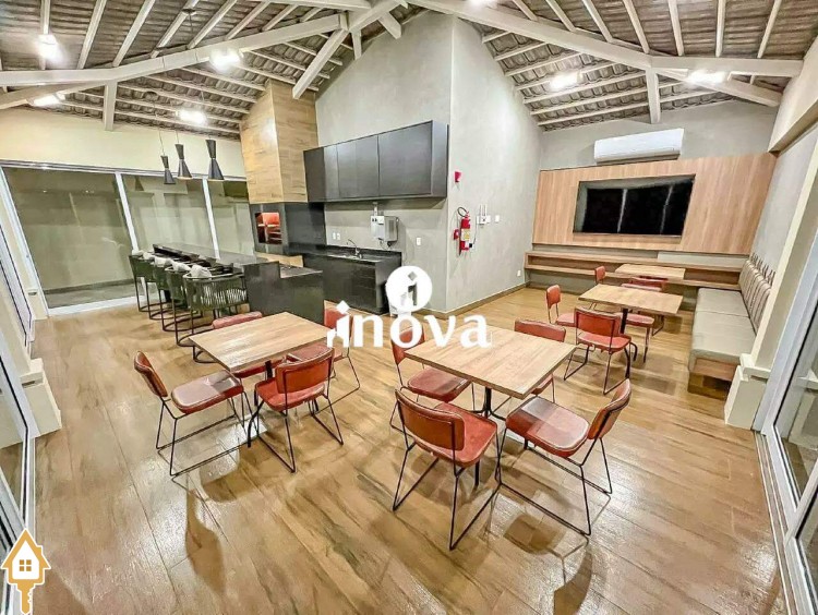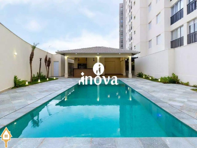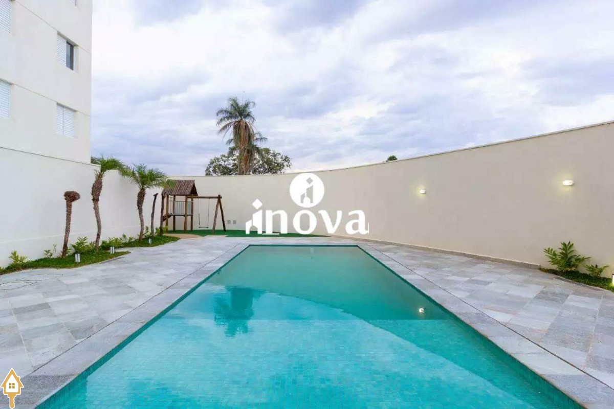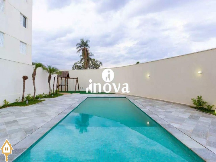 Condomínio com área gourmet com piscina e churrasqueira, salão de festas e playground.