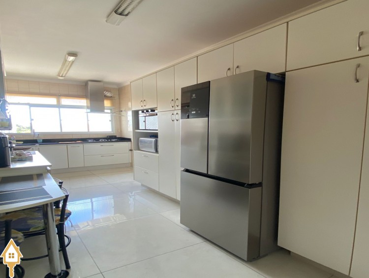 Cozinha equipada com armários planejados, lavanderia também com armários e despensa com prateleiras.