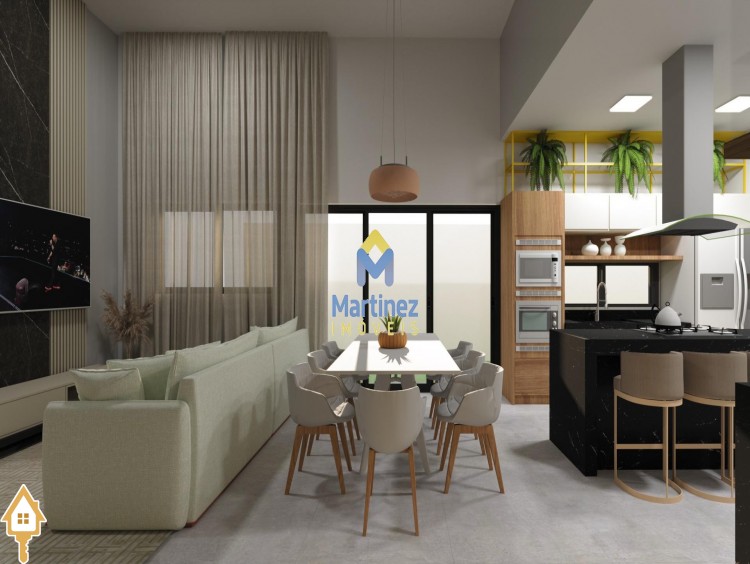 - Salas integradas a cozinha com bancada em ilha e área gourmet.