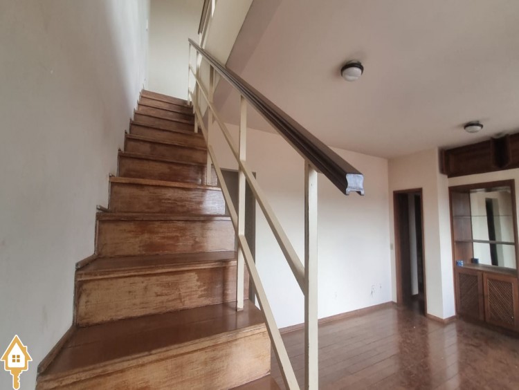 Dúplex, parte de baixo, três quartos sendo uma suíte, todos com armários, sala pra dois ambientes, copa cozinha com armário, área de serviço completa, com quarto para empregada. Parte superior, área gourmet, mais dois quartos sendo uma suíte com hidro massagem. E duas vagas na garagem.