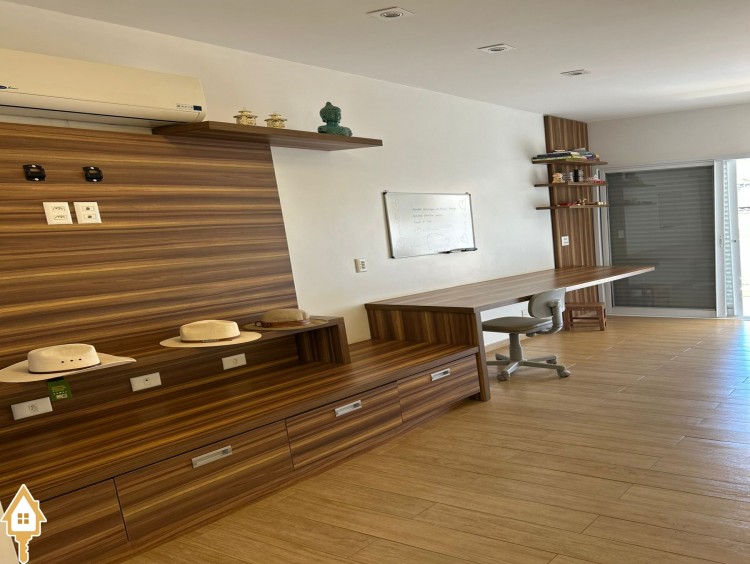 Sala com 4 ambientes integrados: estar, jantar, TV e leitura