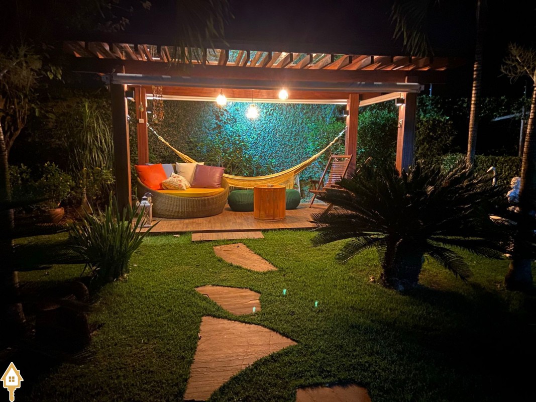 Deck pérgolado em madeira com teto de vidro e persianas automatizadas