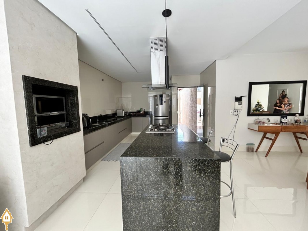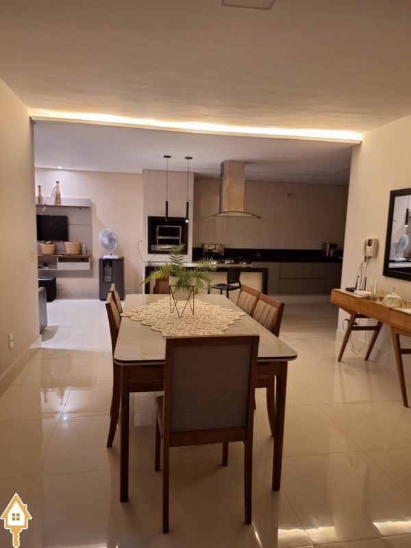 Integração entre sala de jantar, cozinha e área gourmet, criando um ambiente moderno e acolhedor