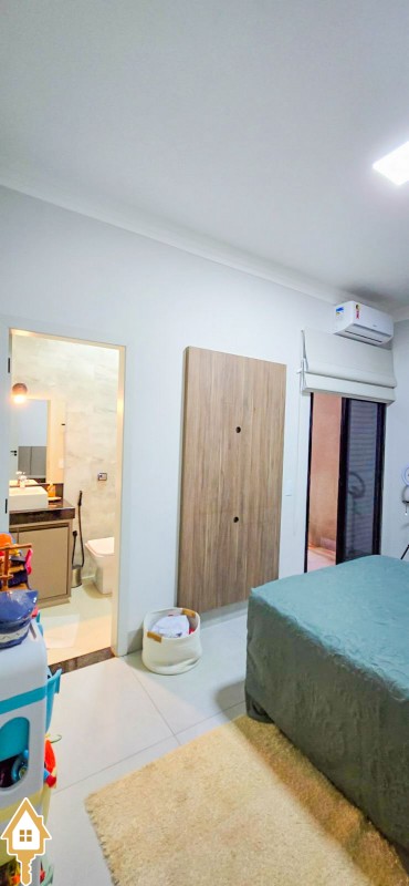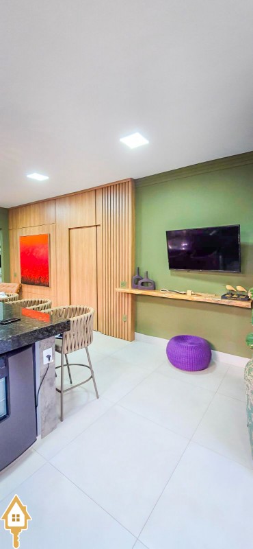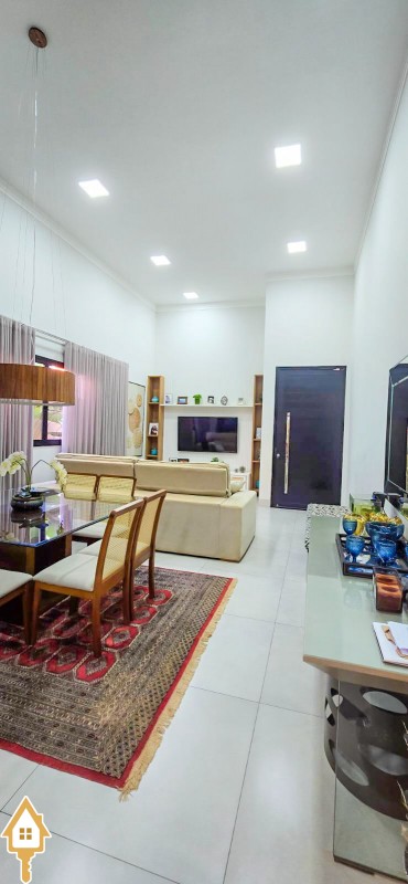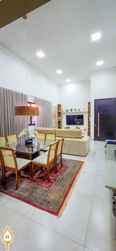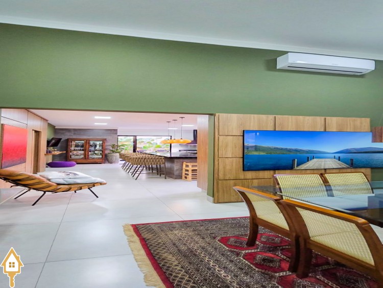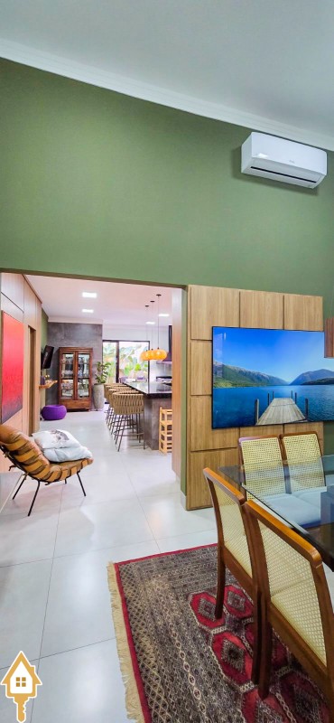 Sala de TV integrada à sala de jantar, equipada com lustre, ar-condicionado e cortinas