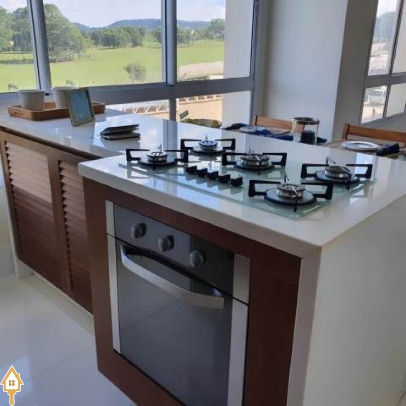 -Cozinha gourmet com ilha possuindo cooktop e forno, churrasqueira a carvão