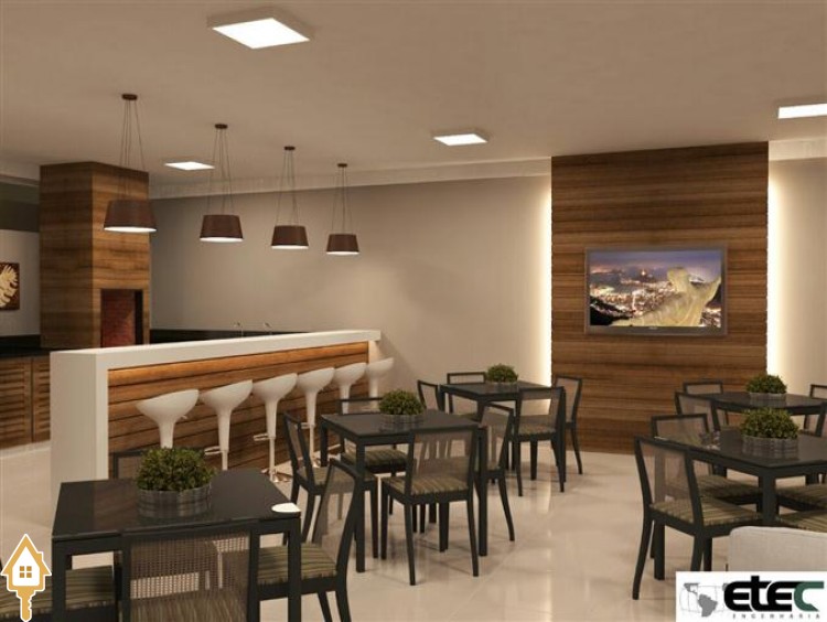 verde Ubatuba e bege Bahia. Salão de festa com espaço gourmet com churrasqueira