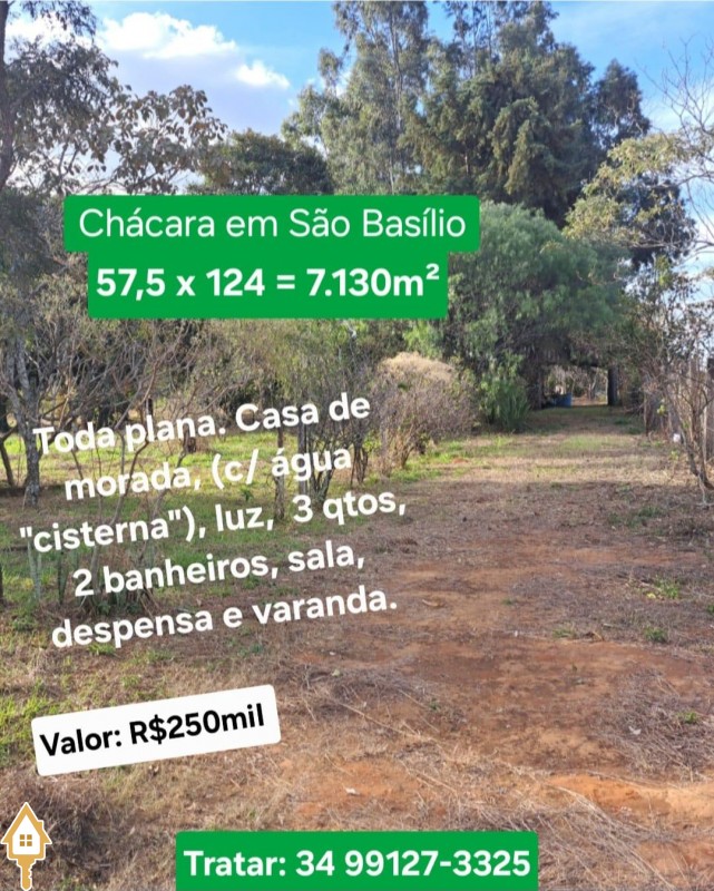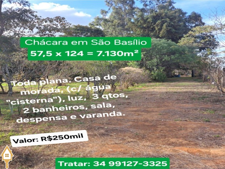 Chácara em São Basílio, totalmente plana, com 57,5 metros x 124 metros, total de 7130 metros quadrados, servida de casa de morada com água (cisterna), luz, 03 quartos, 2 banheiros, sala, despensa, varanda. Documentação OK. Aceita troca por casa menor valor em Uberaba.