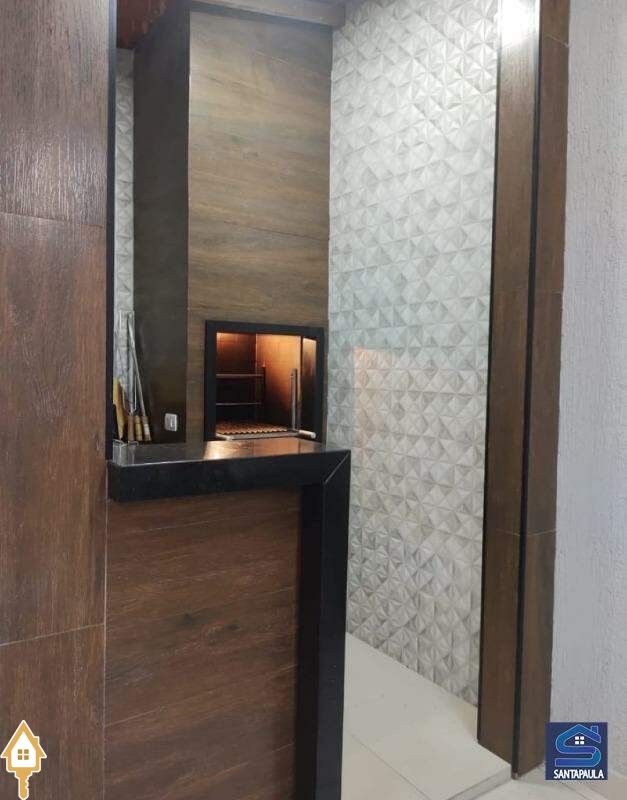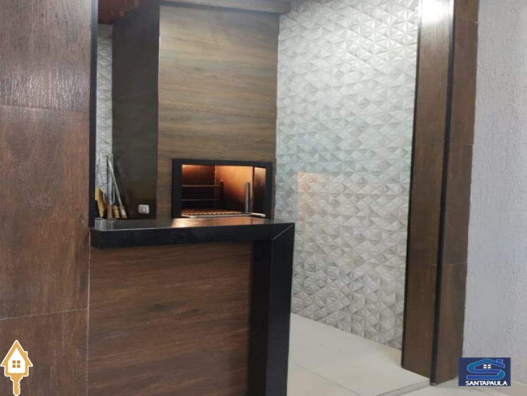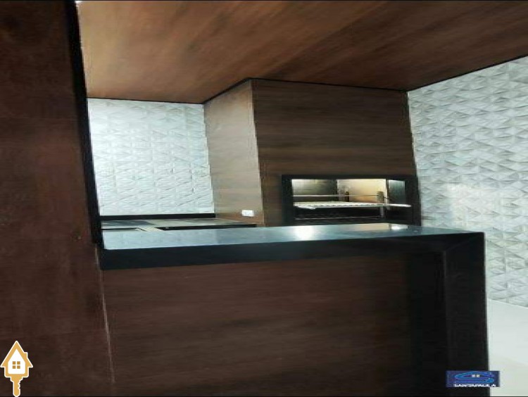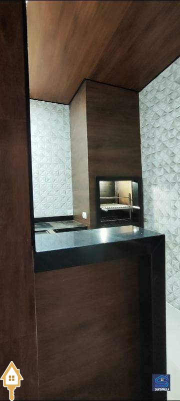 Área gourmet completa: churrasqueira em tijolo refratário, revestimento em porcelanato, grelha em inox e pia com balcão em pedra São Gabriel;