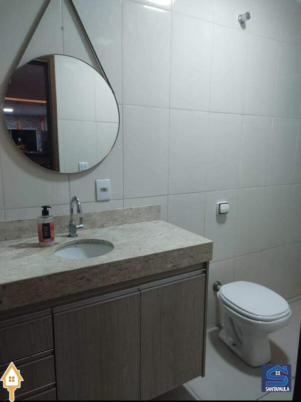 Banheiro social com acabamento refinado em porcelanato, mármore e MDF;