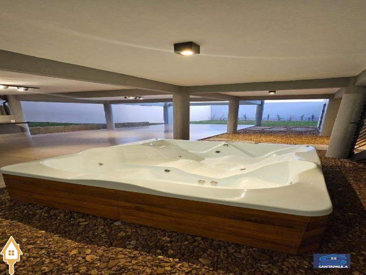 Área de lazer ampla coberta equipada com spa aquecido com hidromassagem para até 7 pessoas