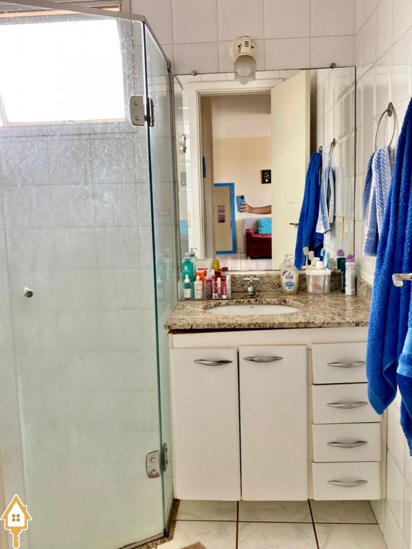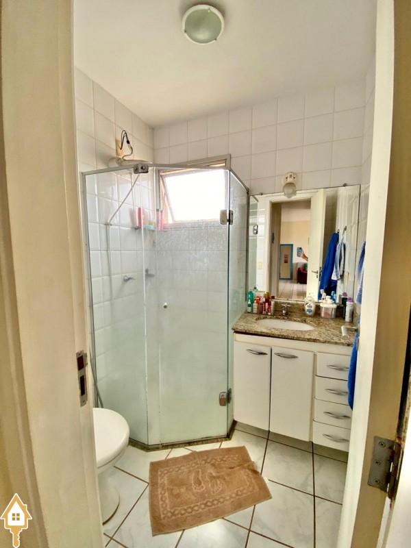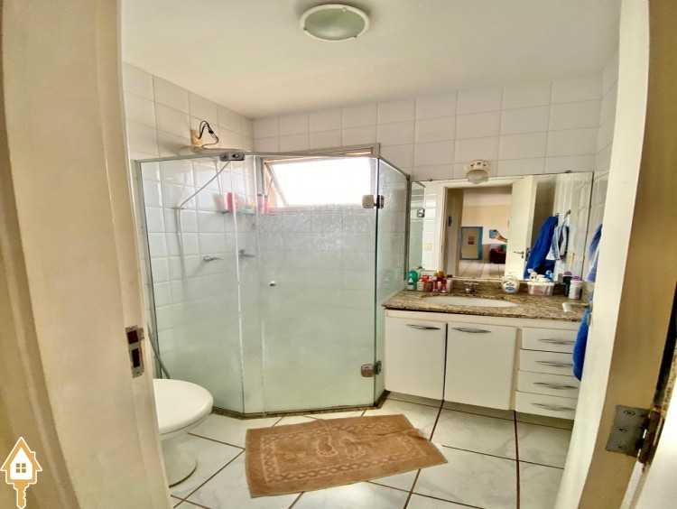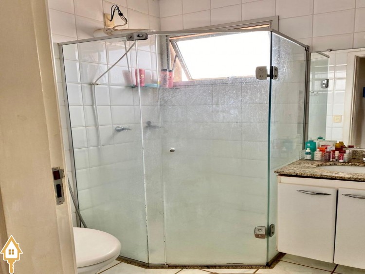 . Banheiro social com espelho, box em blindex e armário