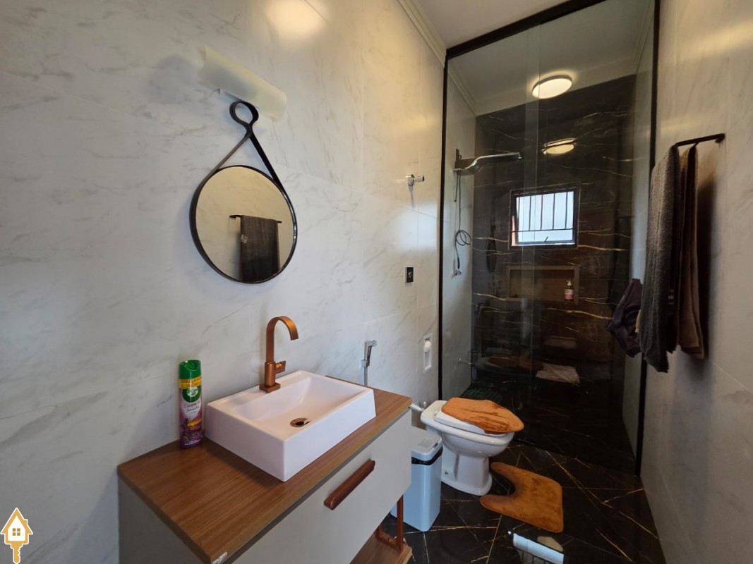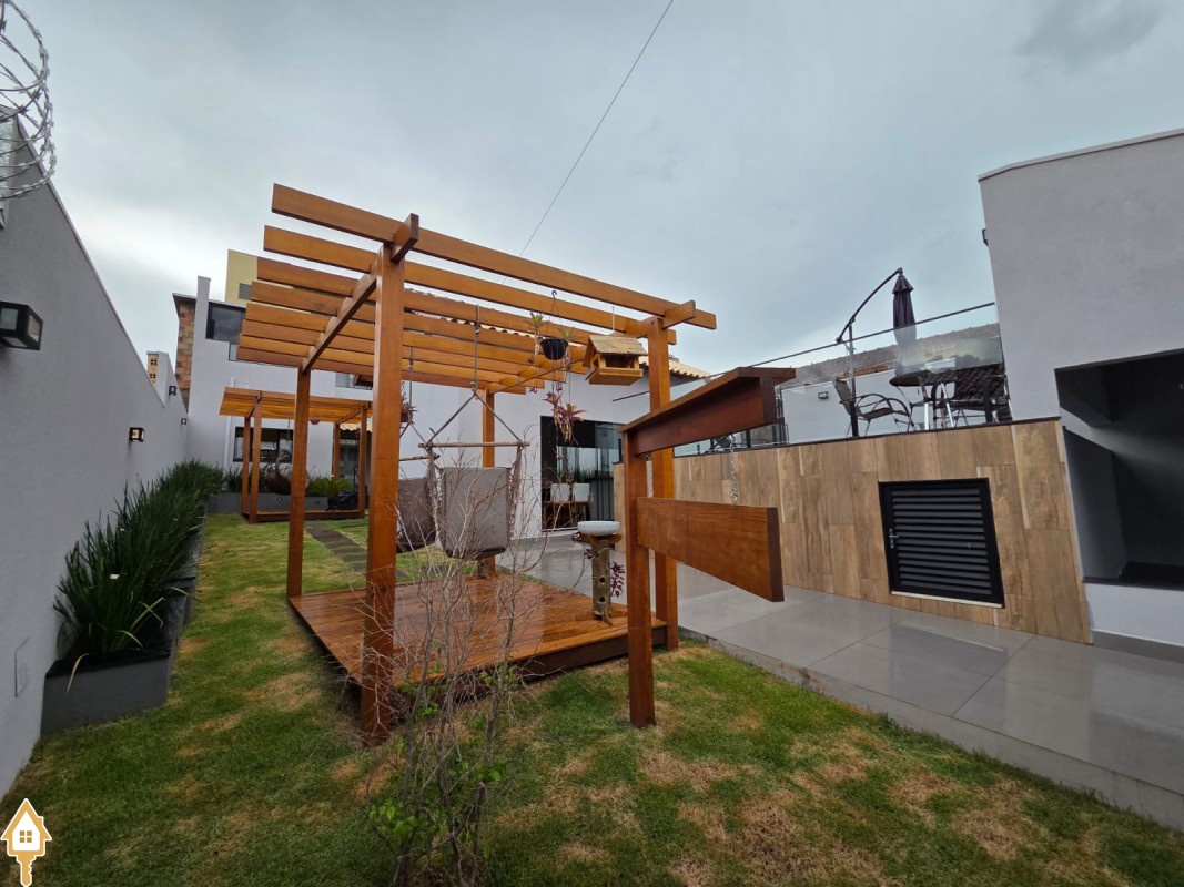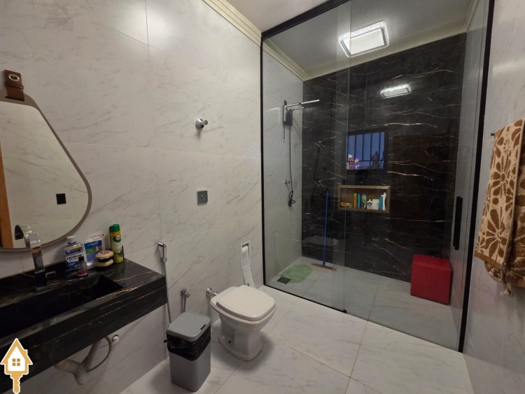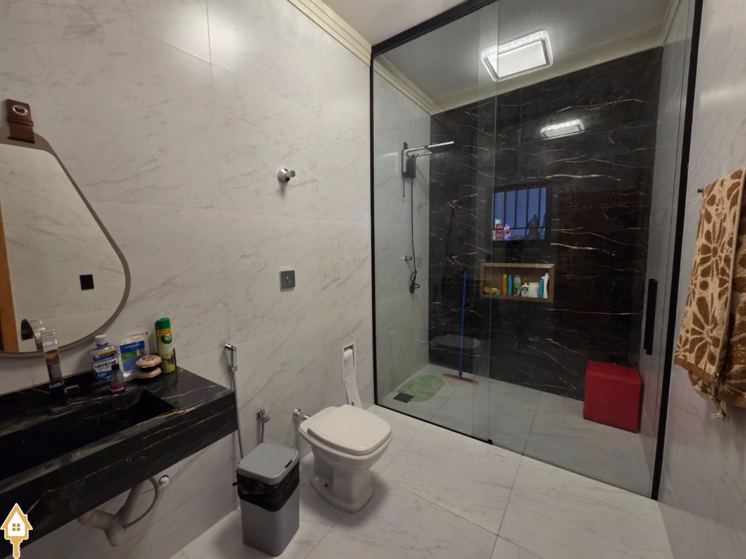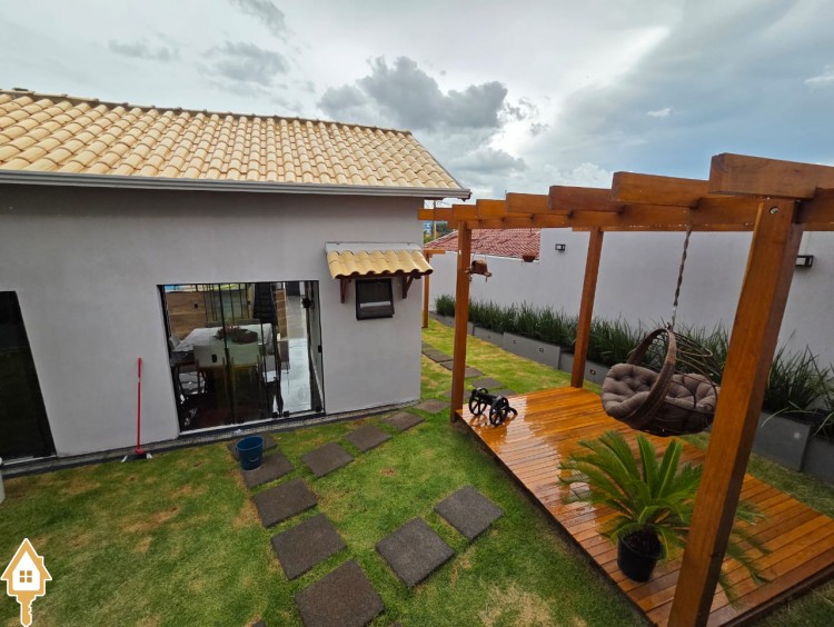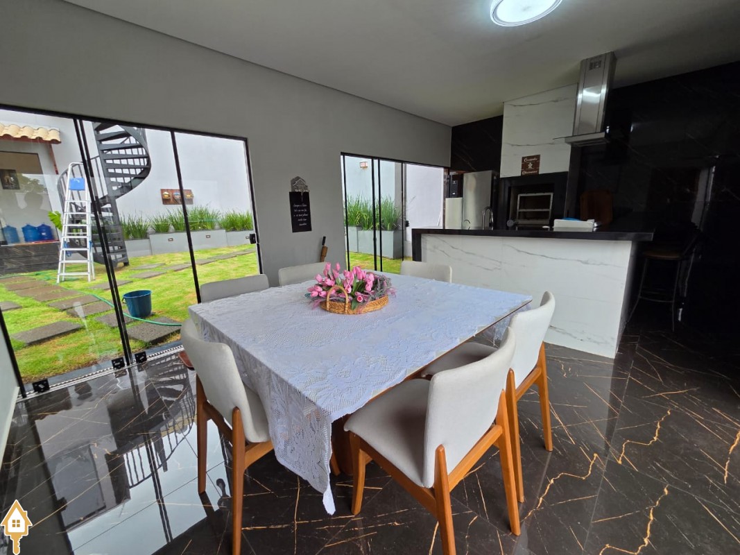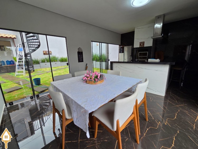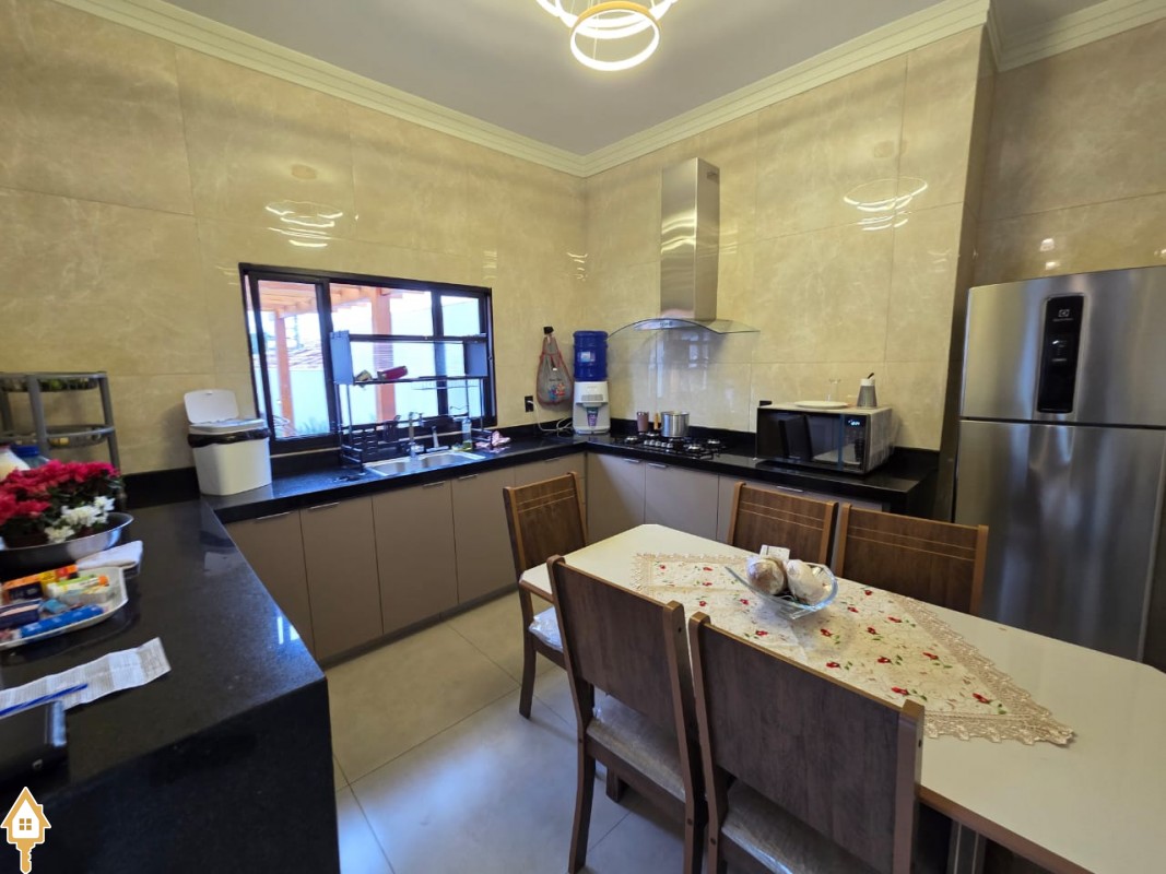 Esta bela casa está construída em um terreno com 384 m², rica em planejados, belíssima iluminação, todas as soleiras e pias em granito São Gabriel.